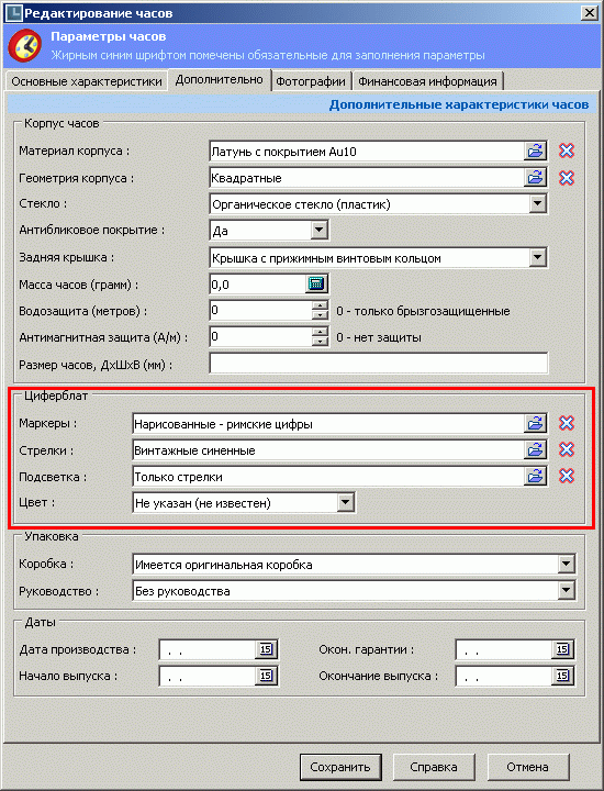 3). Основной каталог построен на базе нескольких подкаталогов, где можно прописать всю номенклатуру типов стрелок, ремешков, механизмов, материалов корпуса и многого другого. Это удобно. Я бы добавил ещё каталогизатор циферблатов, поскольку данная информация вообще отсутствует в программе, а тут тоже масса вариантов (цвет, фактура, сложность и т.п.). Также можно добавить таблицу по безелям. Ещё не помешает таблица ведомости дефектов - сколы, царапины, заводские дефекты и пр.