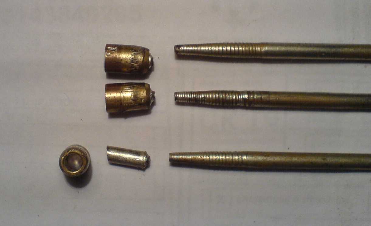 После этого круглым и плоским надфилями за пяток минут на стержнях были запилены шейки диаметром 1,8-2,0 мм (непринципиально) и выполнены конусочки длиной на ширину надфиля - около 6-8 мм (непринципиально).