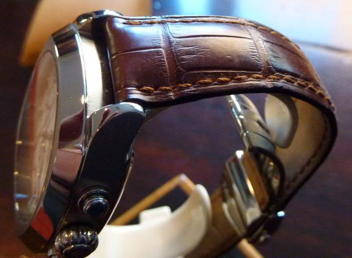 Хронограф. Размер корпуса 38х38 мм. 31 камень. Калибр 36 (36 000 колебаний/час), противоударная система. Функции: часы, минуты, секунды, дата, хронограф с точностью 1/10 секунды. Сапфировое стекло с антибликовым покрытием. Ремешок из натуральной крокодиловой кожи. Прозрачная задняя крышка. Центральная секундная стрелка хронографа. 12-часовой и 30-минутный счетчики хронографа. Часовые стрелки и метки с люминесцентным покрытием. Водостойкость 50 метров. Серийный номер на задней крышке корпуса часов. Запас хода 42 часа.