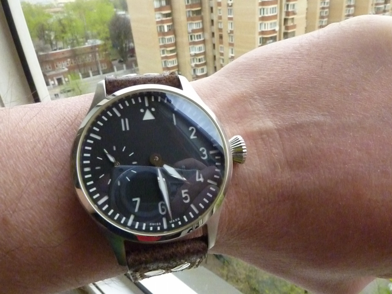 Эффектнейший "пилот" с прозрачной задней крышкой и красивым механизмом Unitas 6497 цвета Gunmetal. "Алмазная" заводная головка - diamond crown. Диаметр корпуса - 44мм, на базовом винтажном ремне из “русской кожи” (юфть), с двумя парами стальных заклепок, имеется также абсолютно новый дополнительный ремень, ширина ремешка - 22мм.