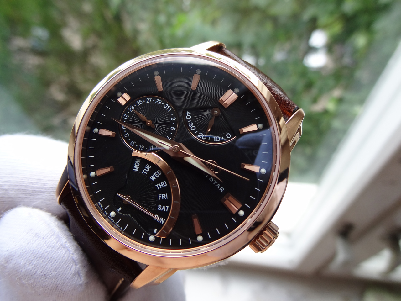 Механизм: 40A52 (автоматический подзавод, возможность ручного завода, остановка секундной стрелки, индикатор запаса хода, ретроградные указатели даты и дня недели).