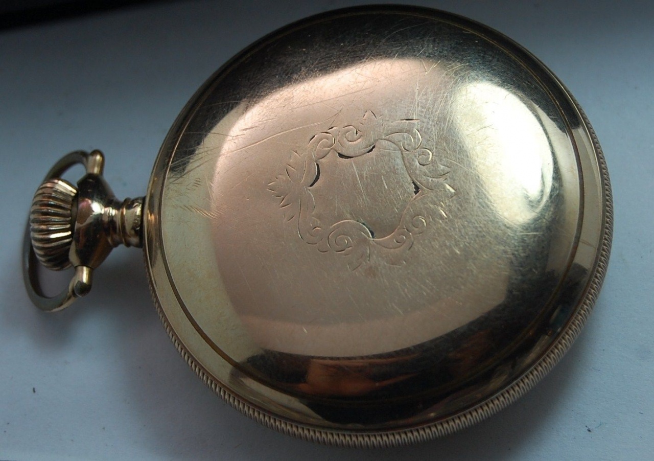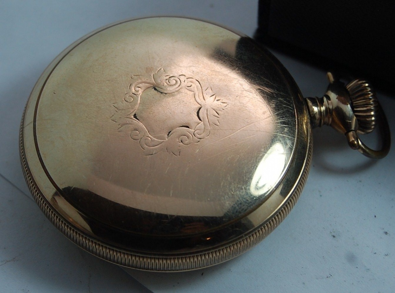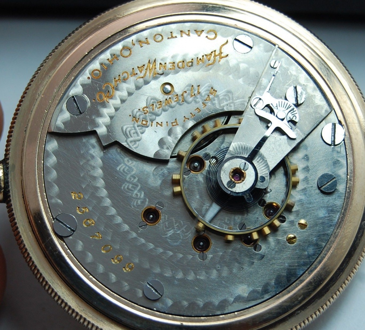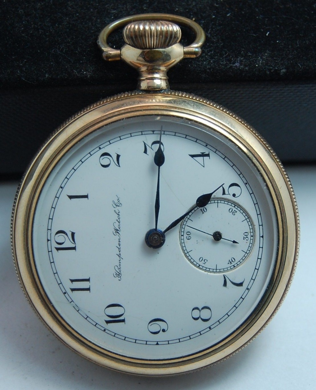 Антикварные карманные часы HAMPDEN WATCH & Co (США) в отличном состоянии. 1909г. Все родное. Позолота 14 карат с 20-ти летней гарантией. Наружный диаметр 54 мм без учета короны. Вороненые стрелки. Механизм 17 камней, на отличном ходу. Стекло и задняя крышка на резьбе. Перевод стрелок с помощью поддавки на "5:00".