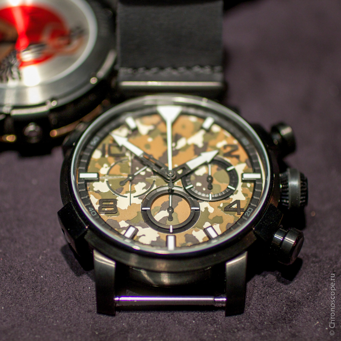 В серии три модели с одинаково массивными 46-миллиметровыми корпусами. Двое часов сделаны из стали, покрытой черным PVD (цена: 9 950 швейцарских франков), а третьи — из красного золота (цена: 12 950 швейцарских франков). Циферблаты каждой модели декорированы камуфляжным рисунком: зеленым, коричневым и серым.