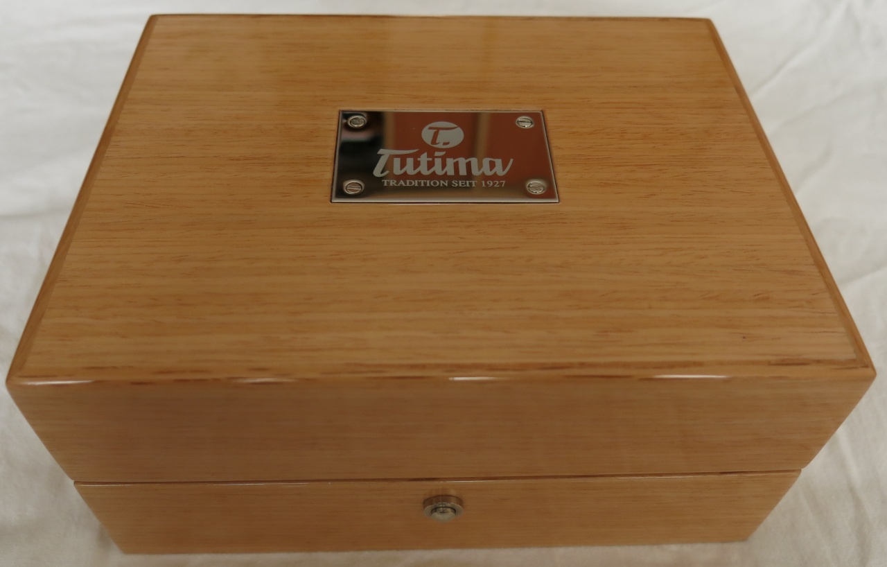 Полный комплект - Лакированная коробка из натурального тикового дерева с замком и стальной табличкой с названием TUTIMA,