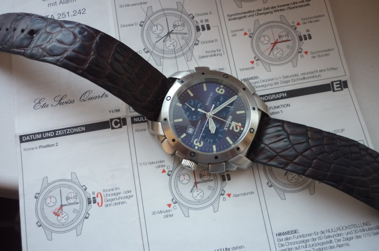 REF. 610 /5963-5964. Функция будильника. Дата. Хронограф. Калибр swiss made ETA 252.241. Сапфировое стекло. WR 50m. Интересный корпус - выполнен в виде иллюминатора. Памообразные. Матированная сталь. Ношены очень не долго. Очень яркий люминорф на стрелках, цифрах и метках - ночью освещает дорогу домой!!!. Качественный НОВЫЙ памовский каучук 22 мм. Обалденный синий отлив циферблата. Диаметр 42 мм. Очень красивые и по настоящему мужские часы. Новая батарея RENATA. Коробка, бумаги. Такие часы купить уже невозможно, выпустили их немного. Часы по настоящему красивые, брутальные и самодостаточные. На зарубежных аукционах за подобные просят от трехсот паундов.