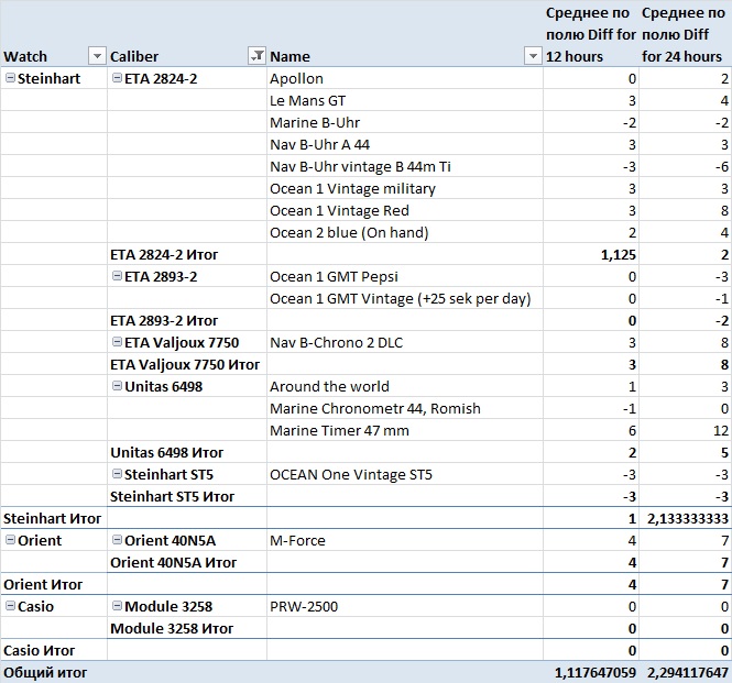 Вот результат 12 часов. Все значения в секундах. Итоговые значения - средняя. Что интересно, часы которые давали +25 сек на руке - идут в "0"