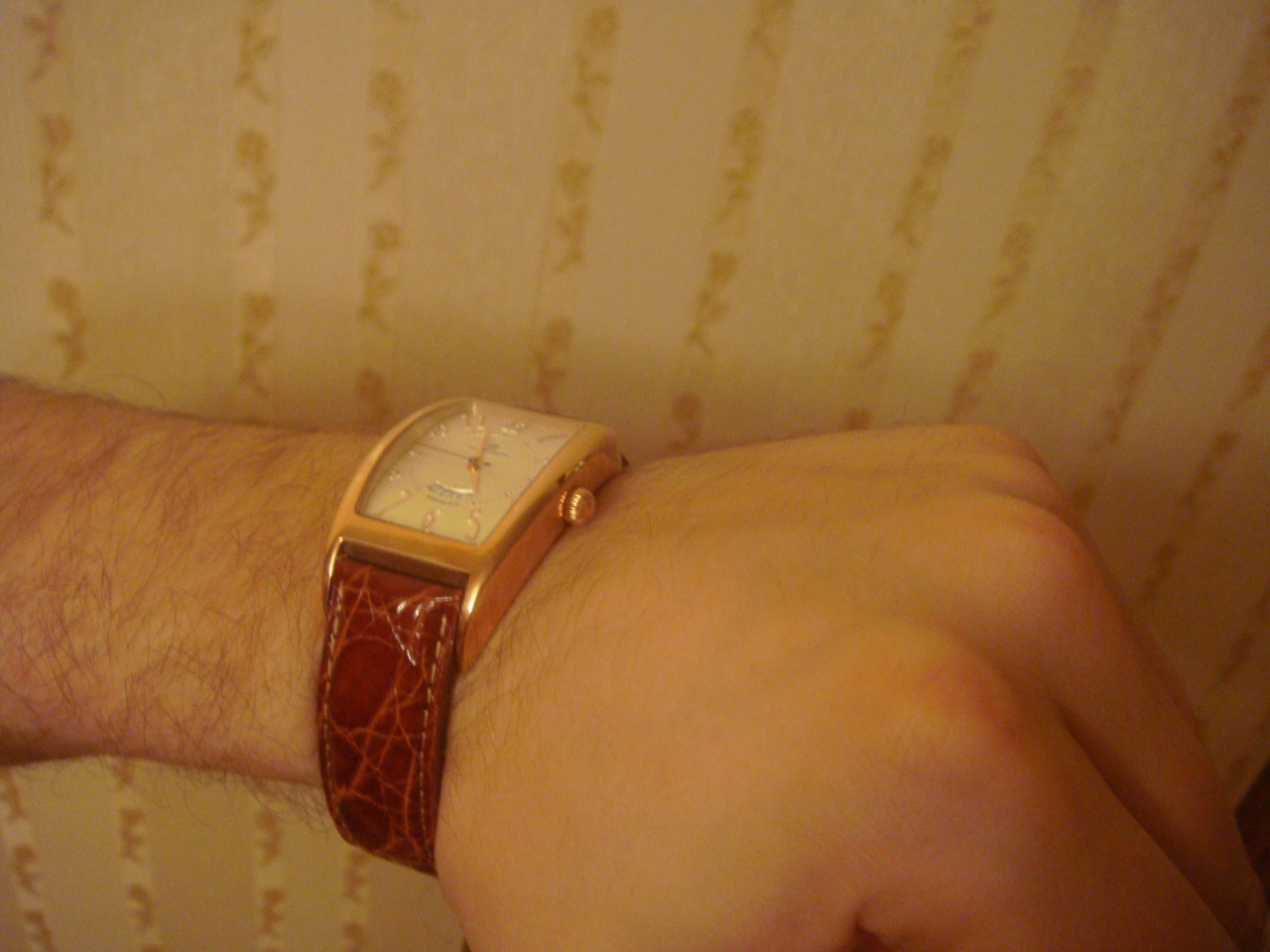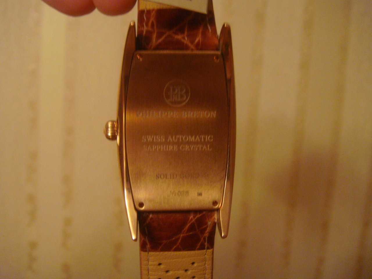Элегантные мужские механические часы марки "Philippe Breton", серия Nostalgie. Швейцарский механизм с автоподзаводом, центральной секундной стрелкой и календарем. Корпус из золота 585 пробы. Часы оснащены противоударным устройством оси баланса; 25 рубиновых камней; сапфировое стекло, ремешок из натуральной крокодиловой кожи, подарочный деревянный футляр. Производство: Москва (Россия).