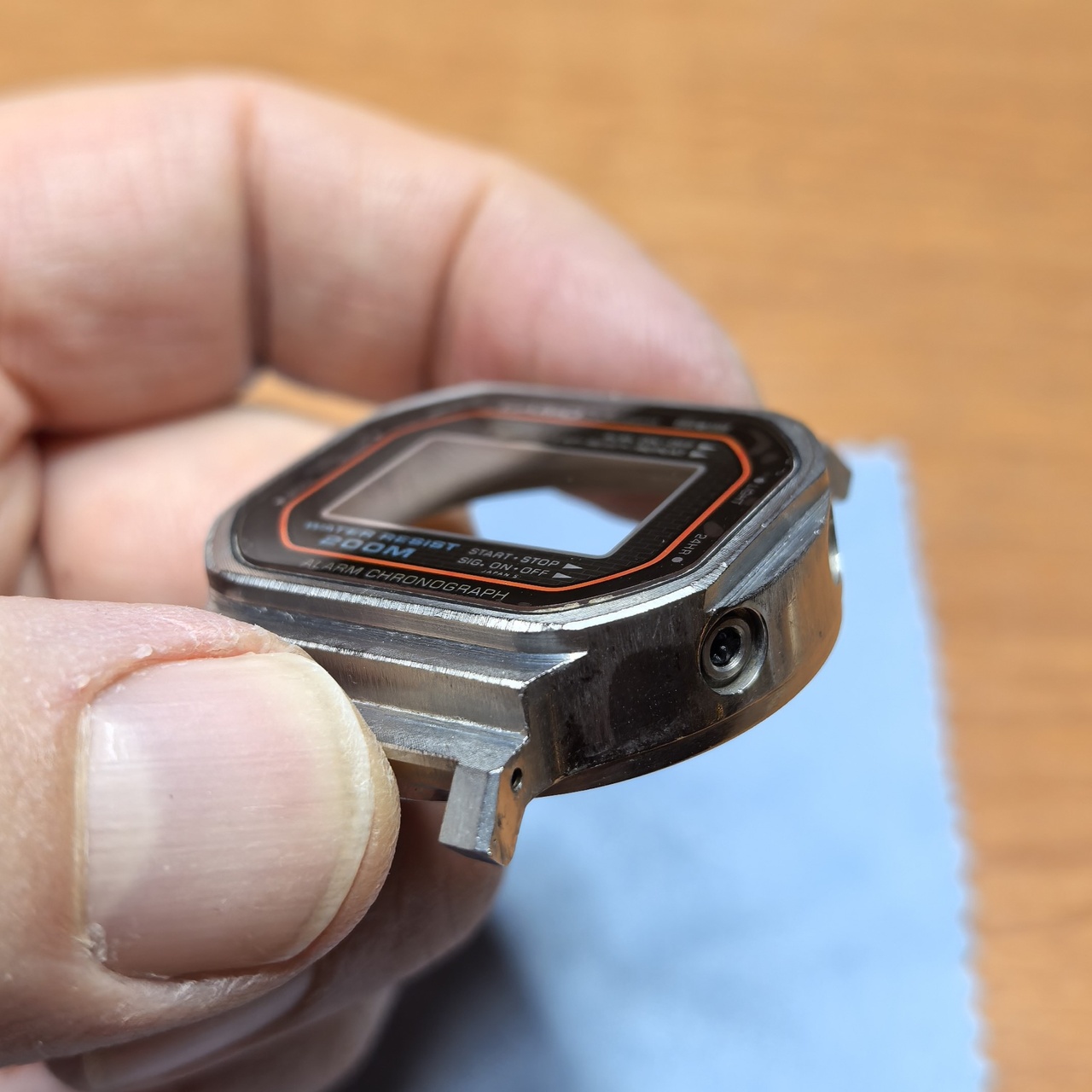 Ко мне они попали с сильно затертым стеклом, на задней крышке когда-то была гравировка, которую потом затерли гравёром же. Желтый цвет надписей Lithium, Alarm chronograph и логотипа Shock resist от времени выцвел. В общем, внешний вид классический, старо-шоковский, часами явно пользовались по назначению))