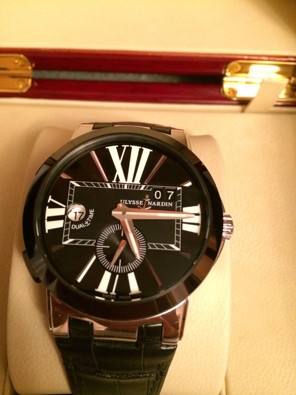 Продаю ULYSSE NARDIN 243-00 Executive Dual Time 43 mm, подарили, примерил один раз при вручении. карточка без даты.Мануфактурный механизм с автоматическим заводом, калибр UN-24, имеет запас хода в 42 часа, частоту колебаний баланса 28 800 пк/час и 34 камня. Центральные часовая стрелка отражает «местное» время во втором часовом поясе и может быть скорректирована вперед или назад скачком в один час при нажатии на кнопки с левой стороны корпуса.Корпус выполнен из нержавеющей стали 316L, его диаметр 43 мм, а высота 12,6 мм. Керамический безель.Сапфировое стекло с антибликовым покрытием.Задняя крышка на 6 винтах с окном из сапфирового стекла.Крокодиловый ремешок с браслетной застежкой, раскладывающейся одним касанием.