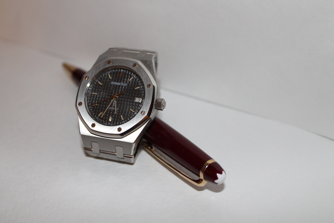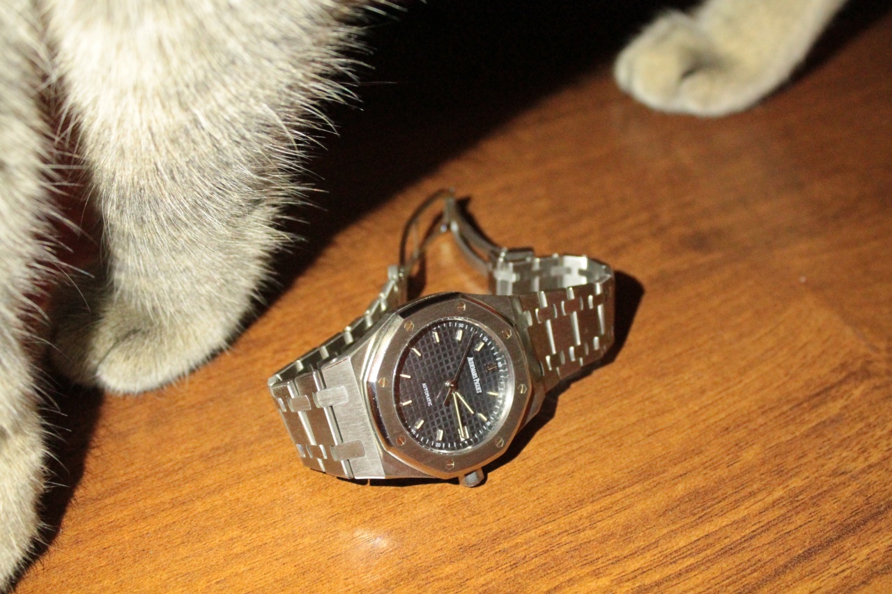 Audemars Piguet Royal Oak, размер корпуса 36*50 мм, толщина 8 мм., болты из белого золота, черный циферблат. Браслет на запястье до 18 см. Репассаж в 2010 г., полировка с регулировкой в 2014г., квитанции есть. Отличное состояние. Любые проверки.