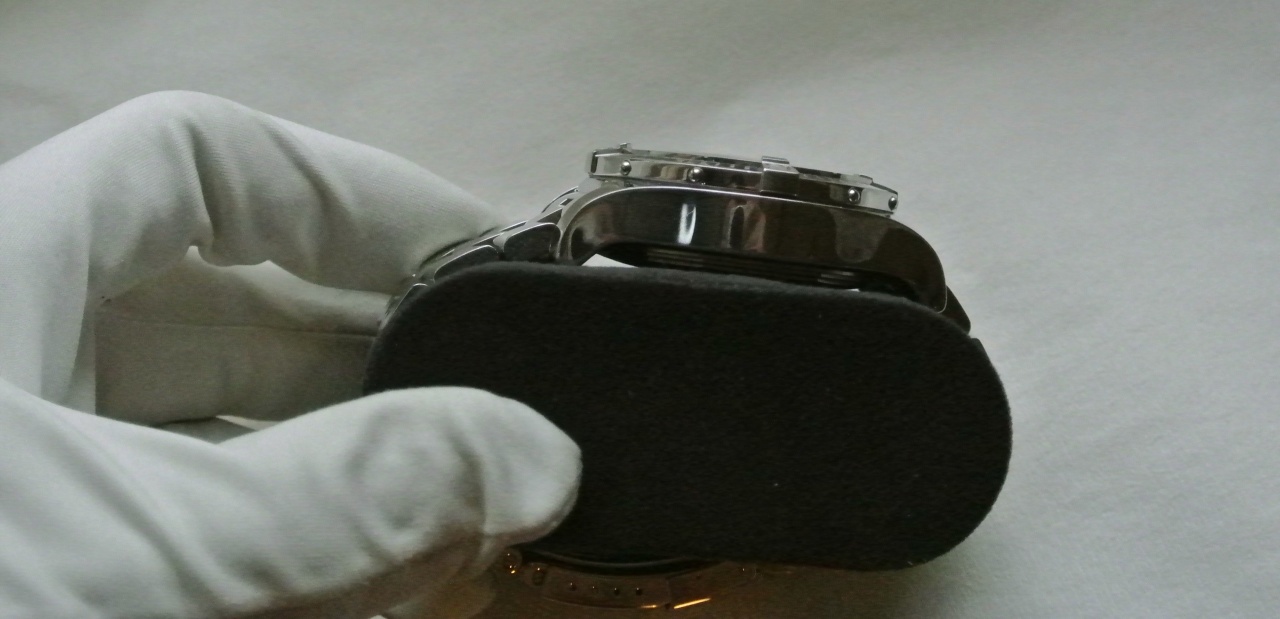 Корпус: Stainless steel, из трех частей, полированный-сатинированный, антимагнитный; вращающийся против часовой стрелки рант с 8 выступающими винтами, люминесцентными метками и 4 креплениями на четвертьчасовых отметках; защищенная заводная головка; защищенные рифленые хронографические кнопки; винтовая задняя крышка с рельефным логотипом и гравированной шкалой преобразования мер и весов.