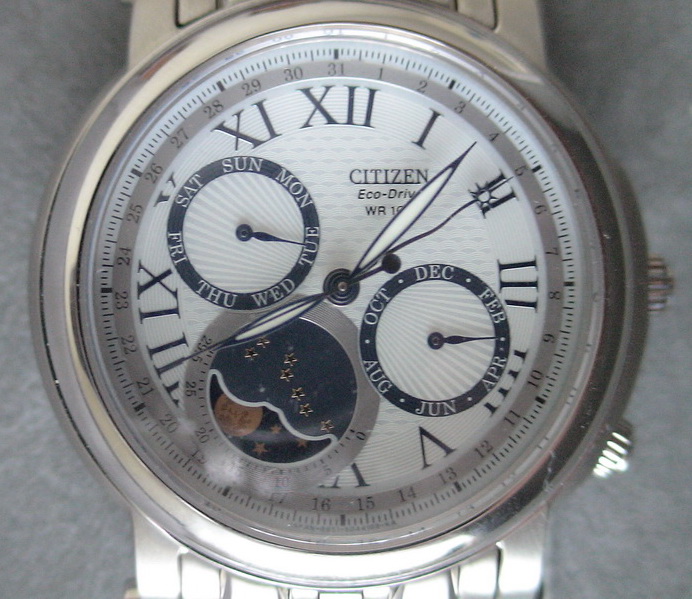 Мужские часы-хронограф с системой Eco-Drive на солнечной батарее, средний срок службы аккумулятора 8-10 лет, запас энергии на 180 дней, указатель лунных фаз, отдельно вынесенные шкалы дней недели и месяцев, календарная шкала вынесена за края циферблата.