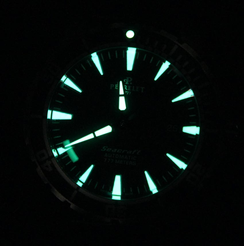 777 метров. Привинчивающаяся заводная головка. Автоматический гелиевый клапан. Вращающийся безель с люминесцентной меткой в положении «12 часов»