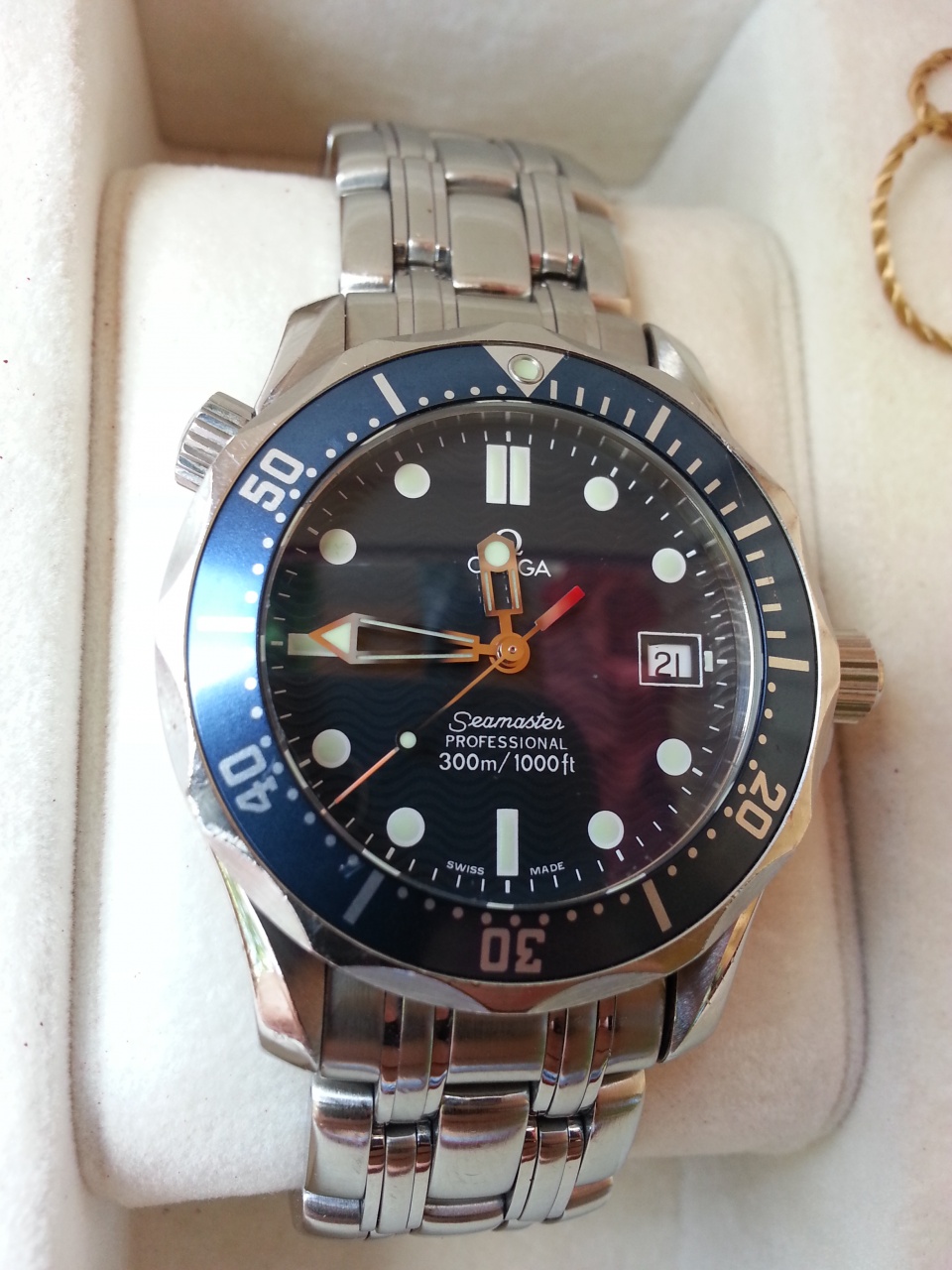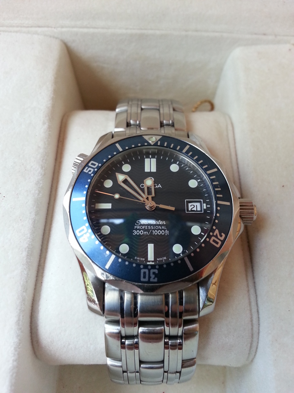 Продаю Omega Seamaster 2561.80.00 Midsize. Часы в хорошем состоянии. Имеют следы повседневного использования. На стекле имеется несколько царапинок/заминок и царапинка антиблика на 2-3 часа. Безель имеет несколько царапинок. Браслет также имеет царапинки. В целом состояние часов хорошее, царапинки в глаза не бросаются. В комплекте короб и бирка. Браслет на 17.5-18 см. Отправлю курьером с полной страховкой или любым другим способом.