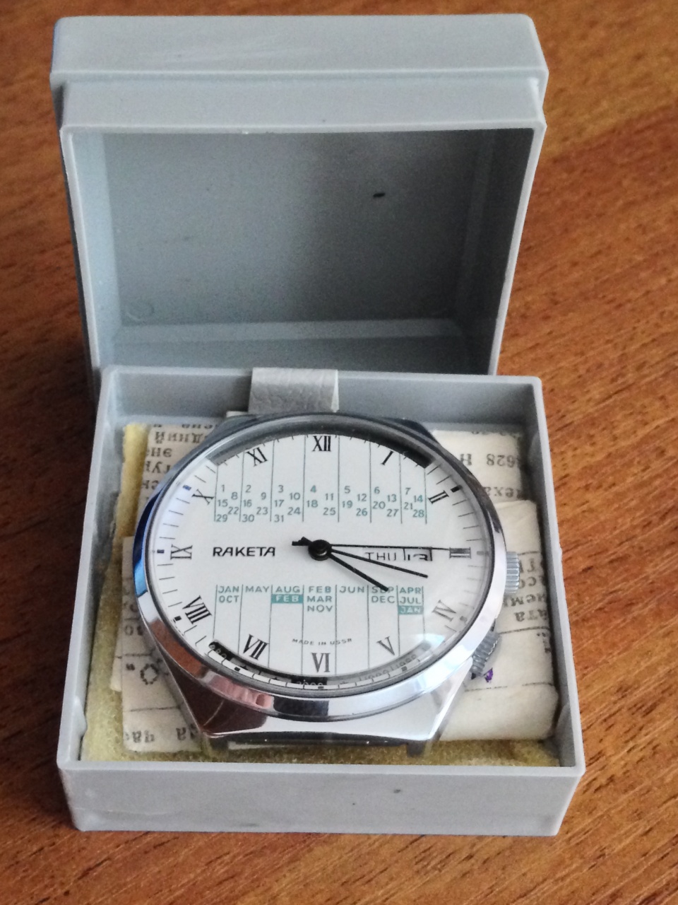 Часы Ракета СССР, вечный календарь с 1980-2000, 1991 года, корпус хром, механизм Ракета 2628H, 19 камней. Центральная секундная стрелка. Противоударные. Продолжительность работы часов от одного полного завода пружины не менее 42 часов.
