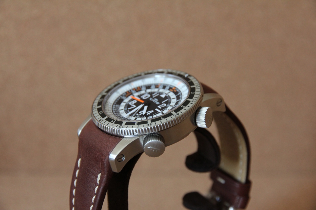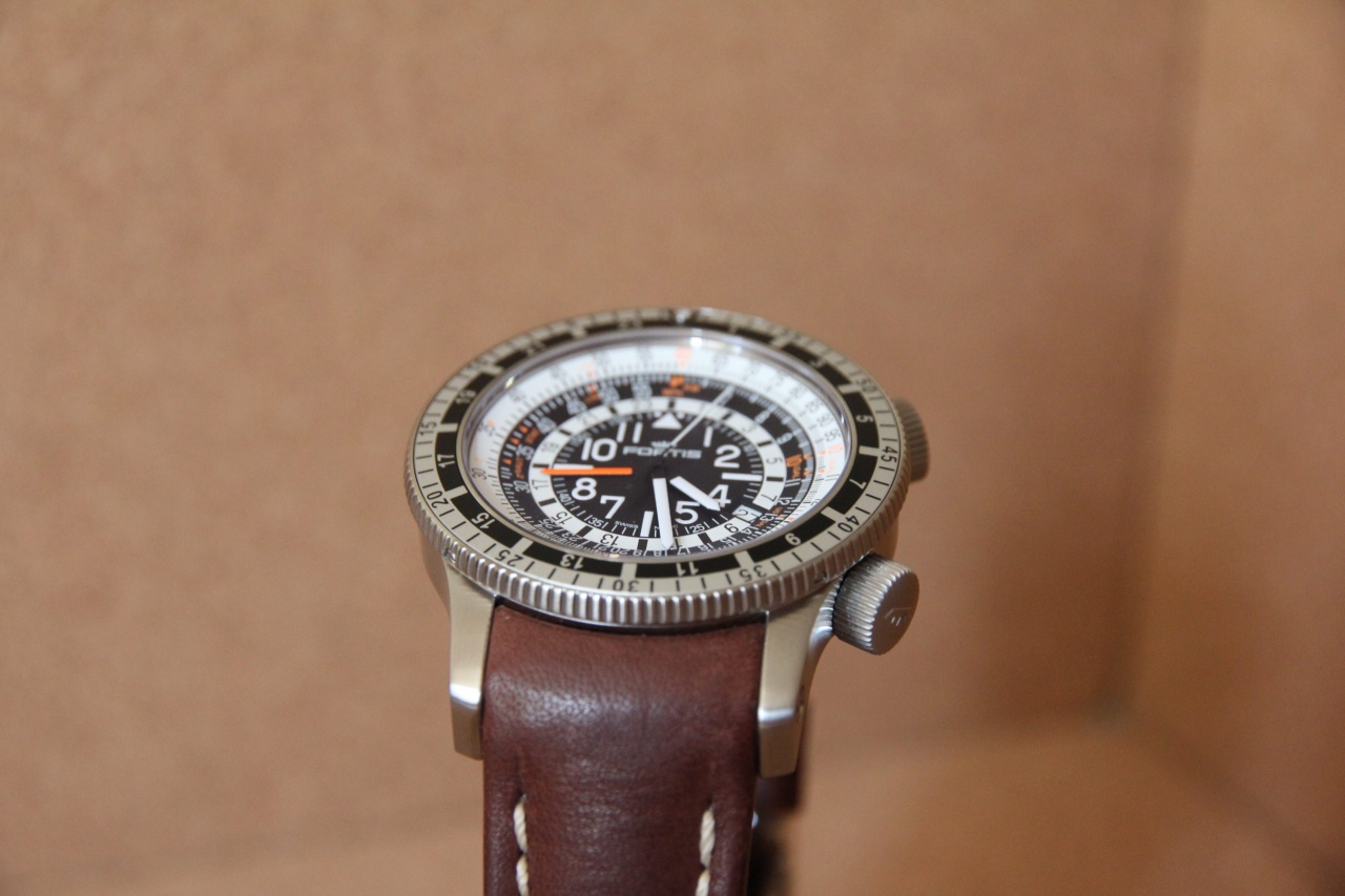 FORTIS B-47 Calculator GMT имеет чередующиеся контрастные черно-белые шкалы: две 24-часовых шкалы, секундная, минутная, а также 60-минутный таймер обратного отсчета и логарифмическая линейка с большим количеством всевозможных вычислений и переводов единиц измерения (например деление, умножение, несколько преобразований скорости в час, расход топлива, расчет высоты расстояние во время восхождения / спуска и т.д.). Арабские цифры, треугольный индекс вместо 12 часов, а также стрелки покрыты люминесцентным составом. На 4 часах расположена апертура даты.