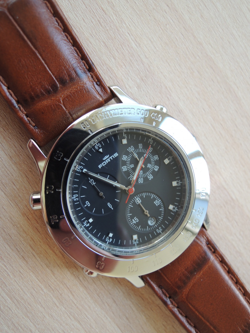 Предлагаю Вашему вниманию весьма редкую модель хронографа от Fortis. Помимо стандартных функций хронографа и тахиметрической шкалы, часы имеют встроенный будильник.
