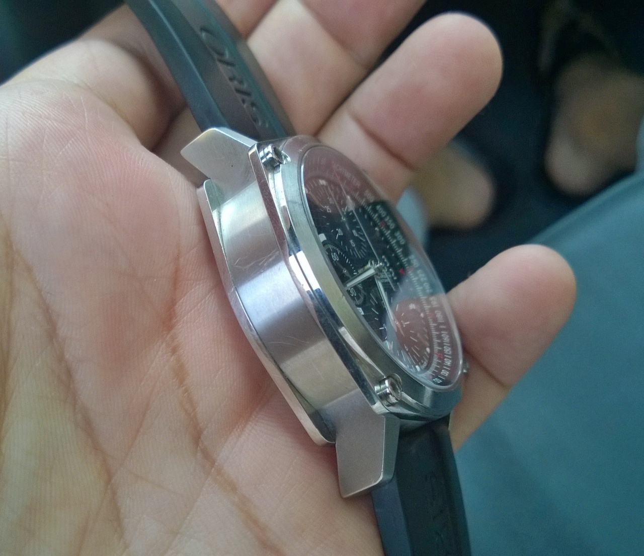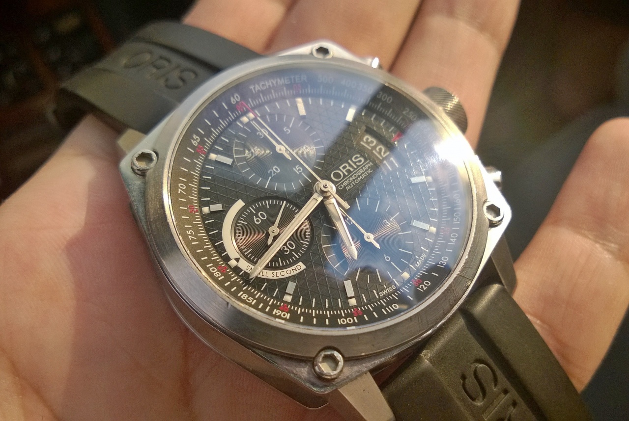 Крупный(43мм!) хронограф от "Орис", с очень броским и интересным дизайном. Современная модель.