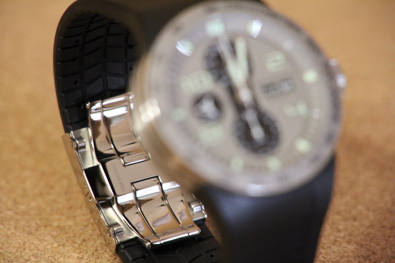 Для сохранения автомобильного облика создатели часов «спрятали» кнопки хронографа, интегрировав их в обод корпуса. Не сразу догадаешься, что небольшие выступы около головки — это и есть кнопки.