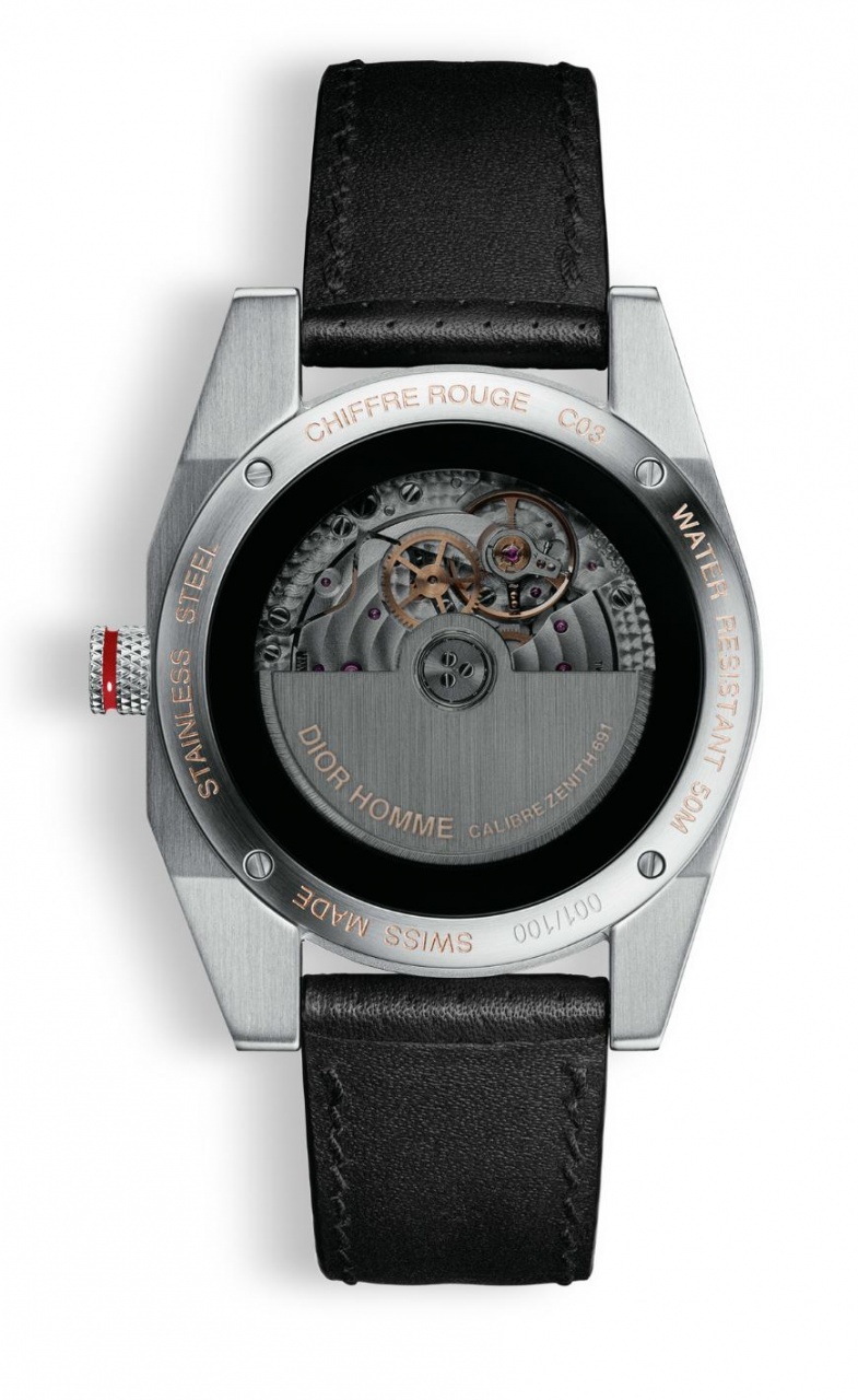 Корпус новой лимитированной модели Chiffre Rouge C03 от бренда Dior сатинированный, изготовленный из нержавеющей стали, диаметром 38 мм, водонепроницаемый до 50 метров. Рифленая заводная головка с круглой красной канавкой, расположена на 3 часах. Сапфировое стекло установлено на передней стороне часового корпуса (с антибликовым покрытием) и на его завинчивающейся задней крышке (тонированное). Циферблат серый, выполненный из металлизированного перламутра, с позолоченными накладными часовыми индексами и стрелками.