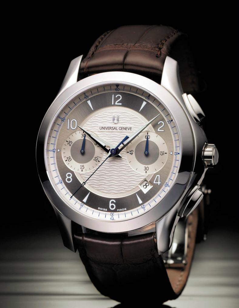 Выпущенный в 1936 году хронометр Compax мог похвастаться революционным на тот момент хронографом: впервые появившиеся счётчики минут и часов отображали суммарное время “события”. Семьдесят три года спустя Universal Geneve представляет лимитированную серию некогда популярной модели. Новая версия часов – гармоничное сочетание изысканности и простоты. Элементы модерна на циферблате и безусловное уважение традиций – взвешенный профессиональный подход. К первым, прежде всего, относиться антрацитового цвета циферблат с гильошированным узором звезд и концентрических сфер Коперника, а также синяя сталь вспомогательных стрелок и указателей. Полированные фактурные стрелки часа с острой кромкой - удачный финальный аккорд композиции. Механизм ручного завода декорирован в лучших традициях часового дела: скос и полировка деталей, пескоструйная обработка поверхности с последующим нанесением антикоррозийного родия, финиширование в стиле Cotes de Geneve. Механизм калибра UG 84.2 реализован на 17 рубинах, скорость вращения – 21,600 пик/ч Стальной корпус. Антибликовое сапфировое стекло циферблата, прозрачное окно задней крышки корпуса. Водонепроницаемость – 50 атм. Браслет – кожа аллигатора, эксклюзивный замок. Стальной корпус – лимитированная версия 190 экземпляров, а также: 70 экземпляров –розовое золото, 20 экземпляров – жёлтое золото.