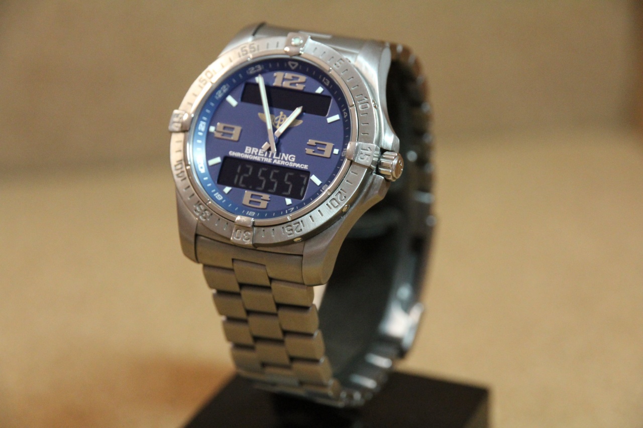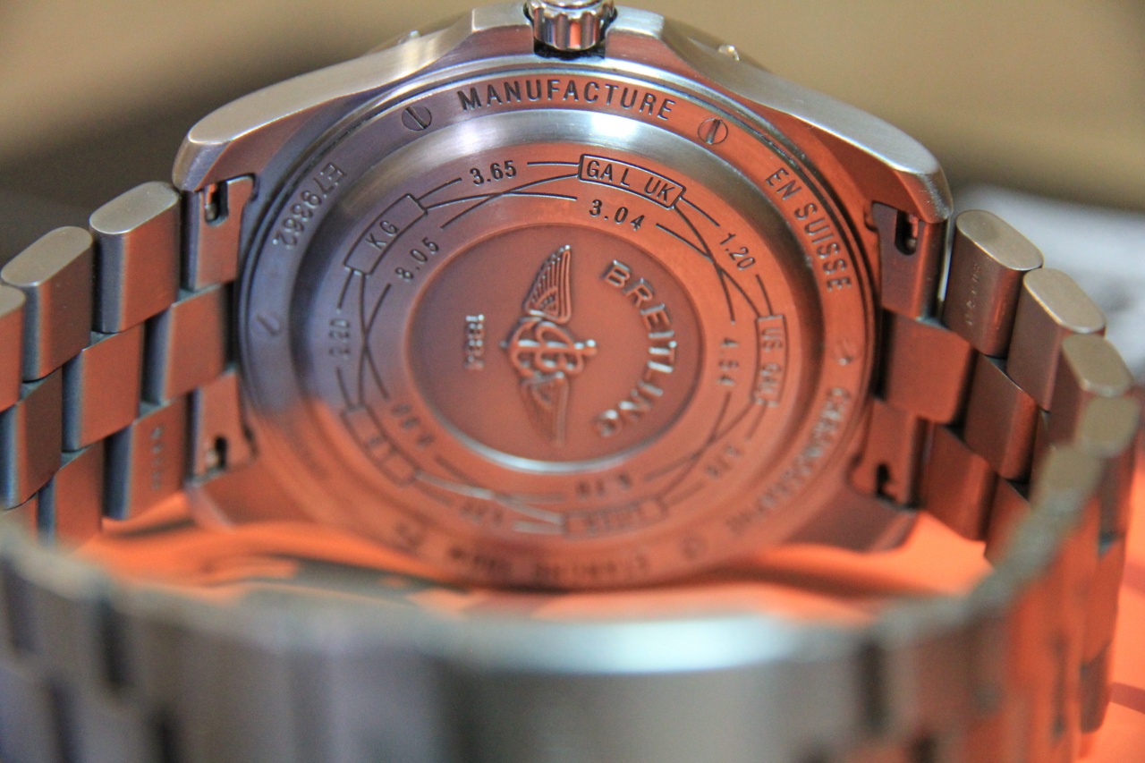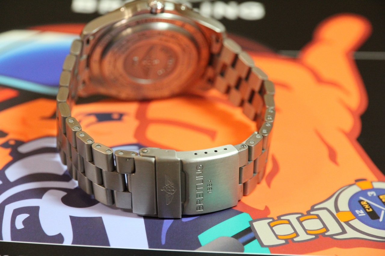 Титановый корпус и браслет, сертифицированный хронометр, синий циферблат, двойное антибликовое покрытие - полное впечатление "отсутствующего" стекла, диаметр 42 мм, толщина 10,5 мм, водозащита 100 метров, функции будильника,второго часового пояса,секундомера и т.д. Сердце часов - SuperQuartz Caliber 79 от BREITLING, знаменитый своей точностью - заявленное отклонение в год составляет не более 15 секунд