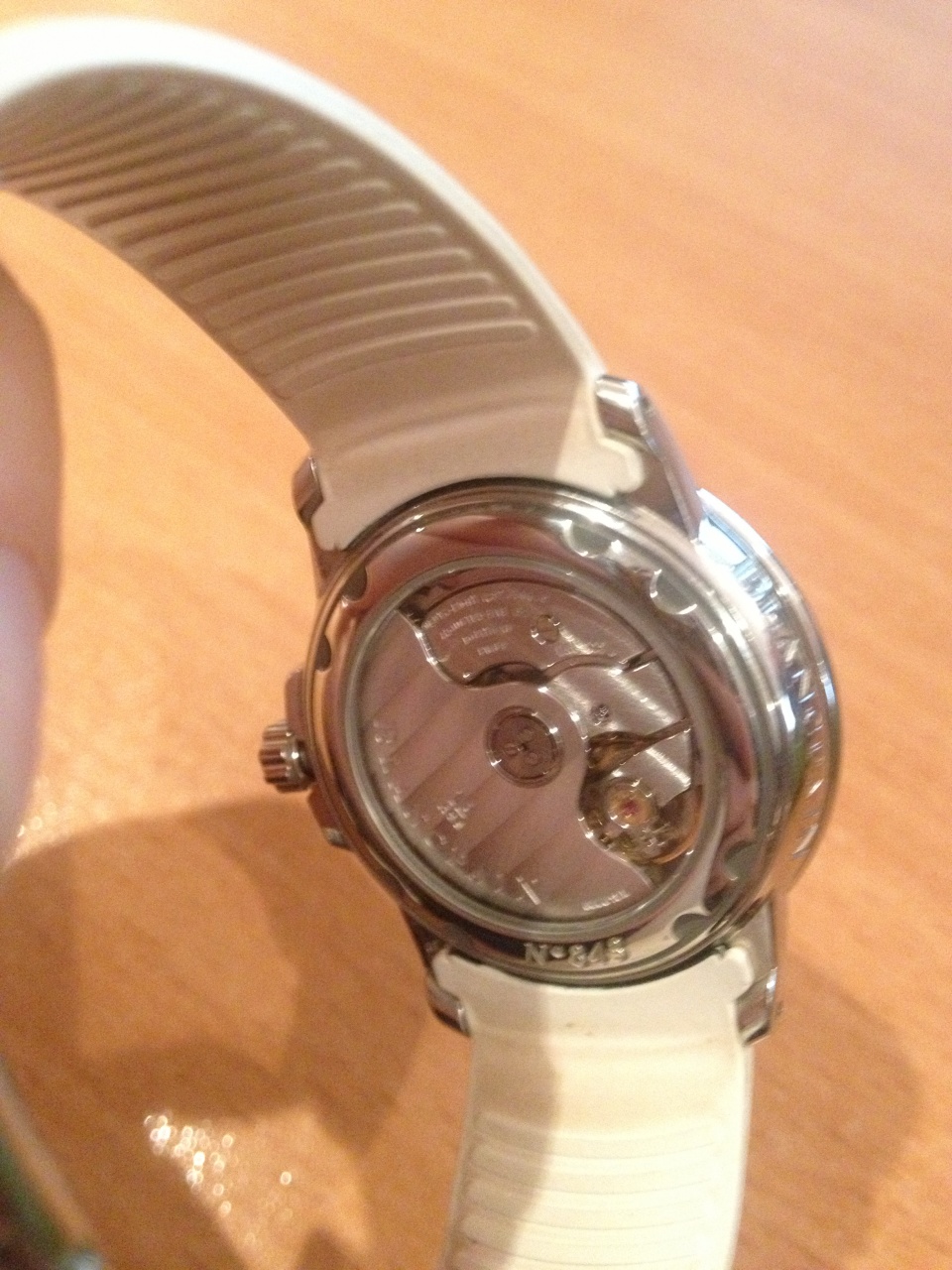 Автоматический механизм. Индикация числа. Размеры корпуса: диаметр - 34 мм, высота - 9,5 мм. Запас хода - 100 часов. Прозрачная задняя крышка. Каучуковый ремешок.