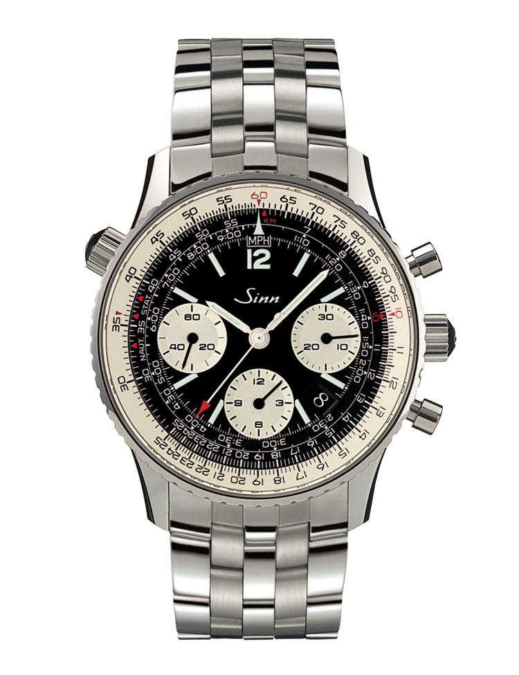 Круглый корпус новинки, изготовленный из титана, диаметром 41,0 мм, толщиной 17,0 мм, водонепроницаемый до 200 метров. Корпус оснащен Sinn's Ar-Dehumidifying Technology (включающую осушающую капсулу, специальные уплотнители и защитное наполнение корпуса инертным газом), что предотвращает попадание влаги на детали калибра. На торце рифленой защищенной завинчивающейся заводной головки, расположенной на 3 часах, выгравирован логотип бренда Sinn. Пушеры хронографа размещены на 2 и 4 часах. Вращающийся безель с минутной разметкой. Сапфировое стекло установлено на передней стороне корпуса и на его завинчивающейся задней крышке. Матово-черный циферблат с напечатанными арабскими цифрами и часовыми индексами, покрытыми, как и часовая, минутная, а также хронографические стрелки, люминесцентным составом белого цвета, с зеленым свечением во тьме. Модель оснащена швейцарским автоматическим механизмом ETA Valjoux 7750, на 25 камнях, с балансовой частотой 28800 полуколебаний в час (4 гц), 42-часовым запасом хода, функциями индикации часов, минут (посредством соответствующих центральных стрелок), секунд (на соответствующем малом боковом циферблате, расположенном на 9 часах), даты (посредством соответствующего цифрового указателя в апертуре, расположенной на 3 часах), а также с хронографом (центральная секундная стрелка с оранжевым противовесом и круглый аналоговый 30-минутный счетчик, расположенный на 12 часах). Ударостойкость калибра соответствует критериям DIN 8308, защита от воздействий магнитными полями - критериям DIN 8309.