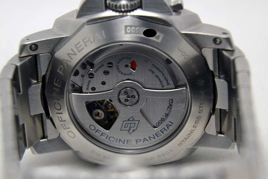- Механика с автоподзаводом, калибр Panerai P.9001, баланс из сплава Glucydur®, противоударное устройство Incabloc®, запас хода 3 дня, два заводных барабана