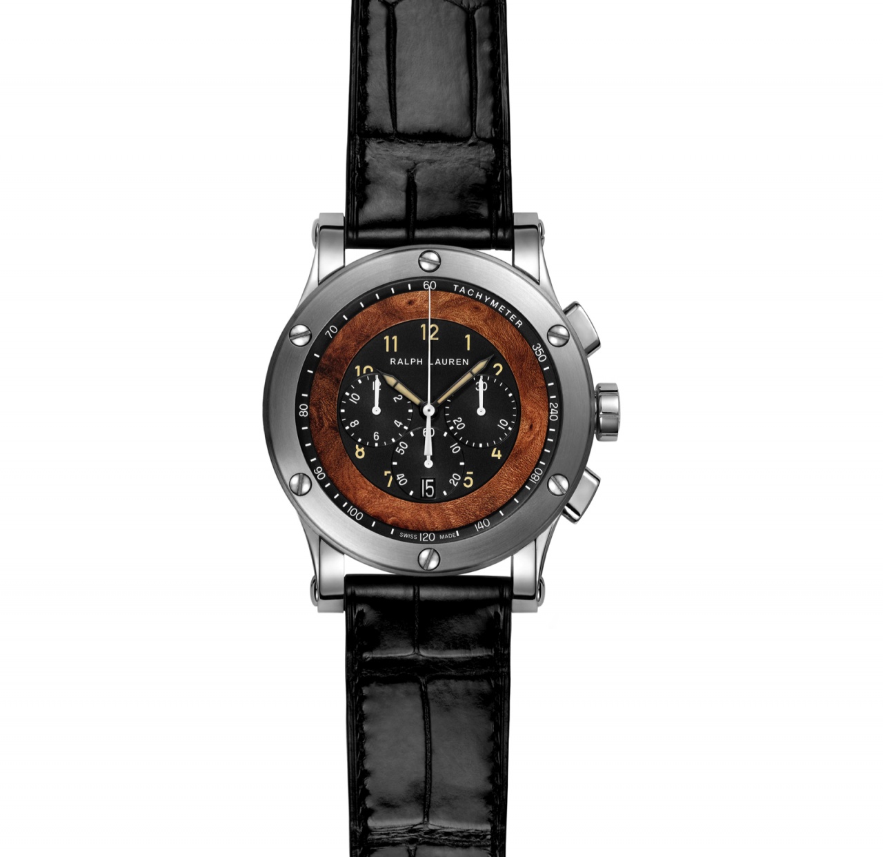 Круглый корпус новинки изготовлен из нержавеющей стали, диаметром 44,80 мм, толщиной 12,20 мм, водонепроницаемый до 50 метров. Фиксированный безель на шести винтах. На торце рифленой заводной головки, расположенной на 3 часах, выгравирован логотип бренда Ralph Lauren. Пушеры хронографа размещены на 2 и 4 часах. Сапфировое стекло установлено на передней стороне корпуса (выпуклое, с внутренним антибликовым покрытием) и на его задней крышке. Циферблат матово-черного цвета, с арабскими цифрами, часовой и минутной стрелками мечевидной формы, покрытыми люминесцентным составом SuperLuminova бежевого цвета. Периферийная часть циферблата изготовлена из вяза, такого-же, который был использован при отделке приборных панелей классических автомобилей Bugatti Ralph Lauren. На черном фланце имеется круглая тахиметрическая шкала.