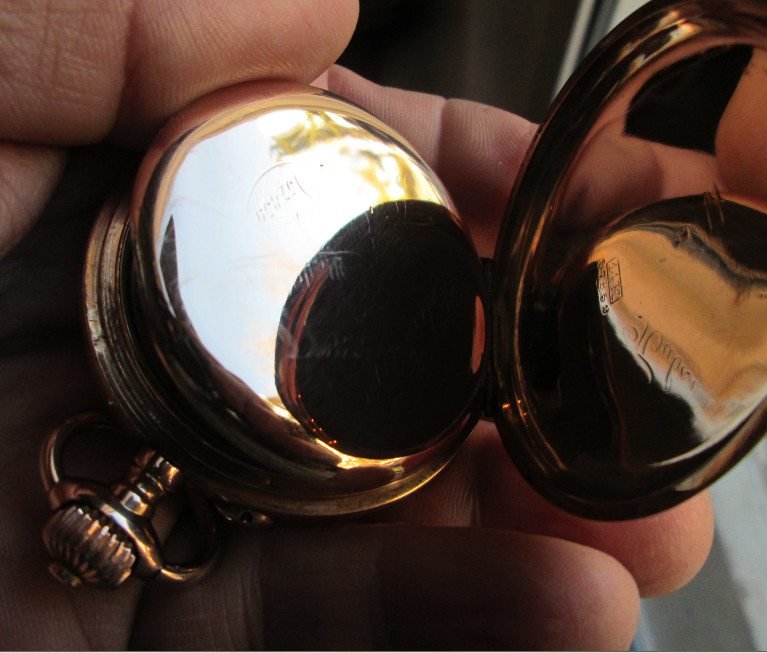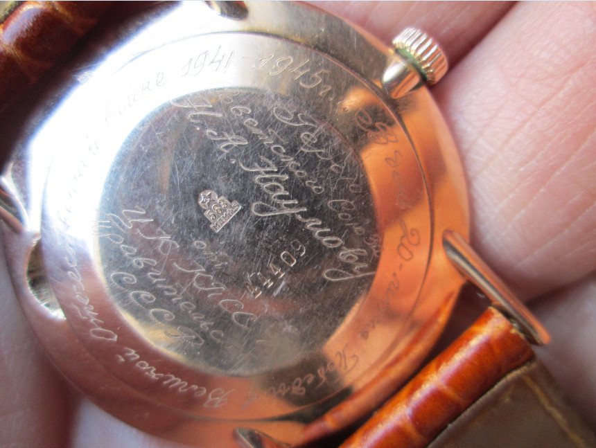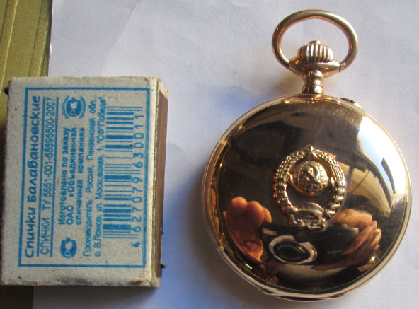 Понятно,что для большей значимости,на крышку часов был посажен Герб,того времени с 11лентами(по кол-ву республик) и была "зачистка"(заполировка) по понятным причинам -"Его Величества...."