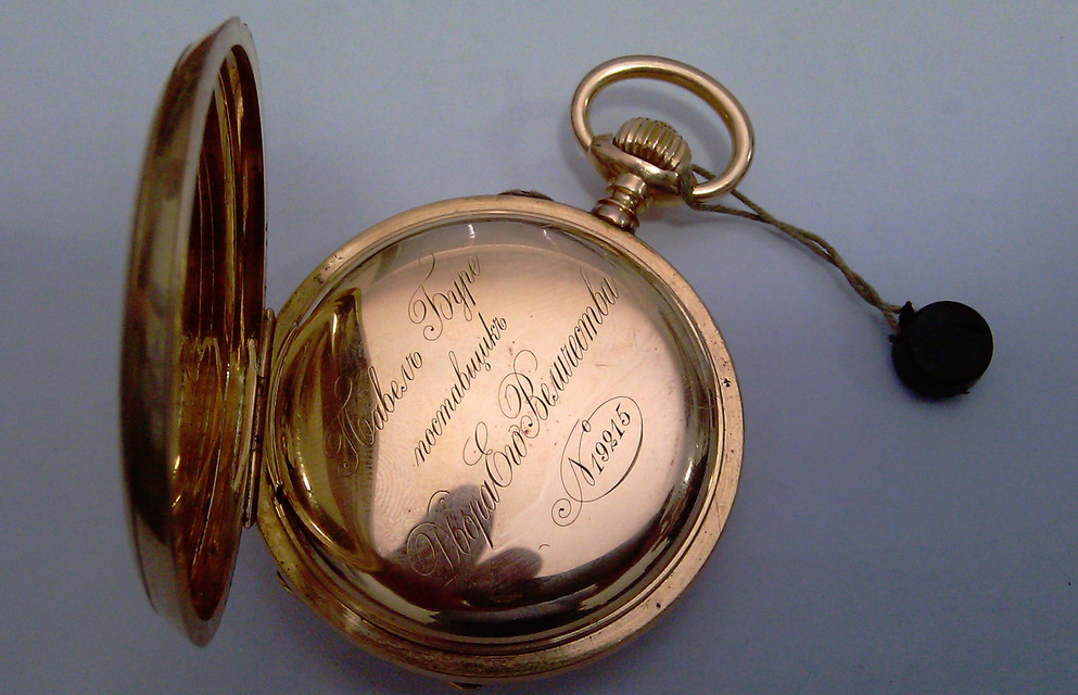 Со слов кавалера наград,именные часы Павел Буре,были вручены ему сразу после воздушного боя ,в небе над г. Севастополь ,самым молодым наркомом СССР.При этом при наркоме ВМФ,всегда находился адъютант с чемоданчиком в котором носились награды и старичок,мастер-гравёр.Судя по всему,достаточно талантливый и известный.