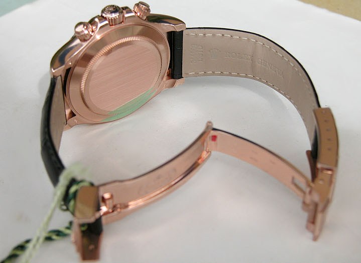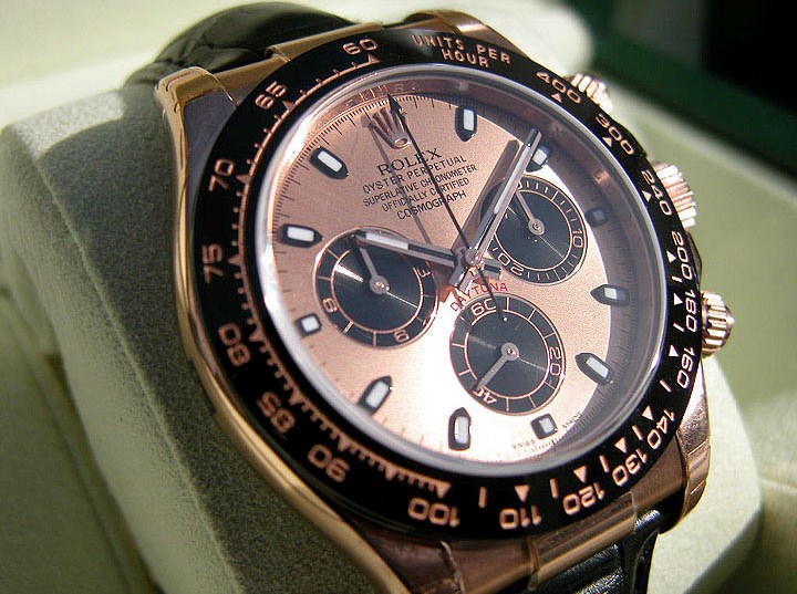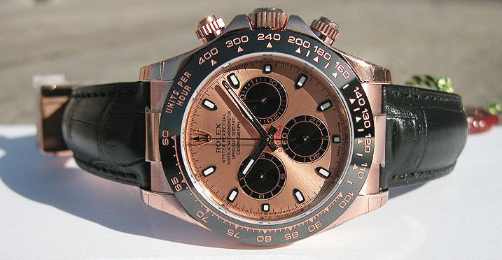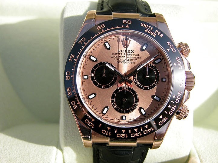 Гармоничный вариант циферблата золотисто-розового цвета с черными хронометрами и корпусом из золотого цвета от Ролекса в очередной раз заставляют полюбить новый шедевр часового дела