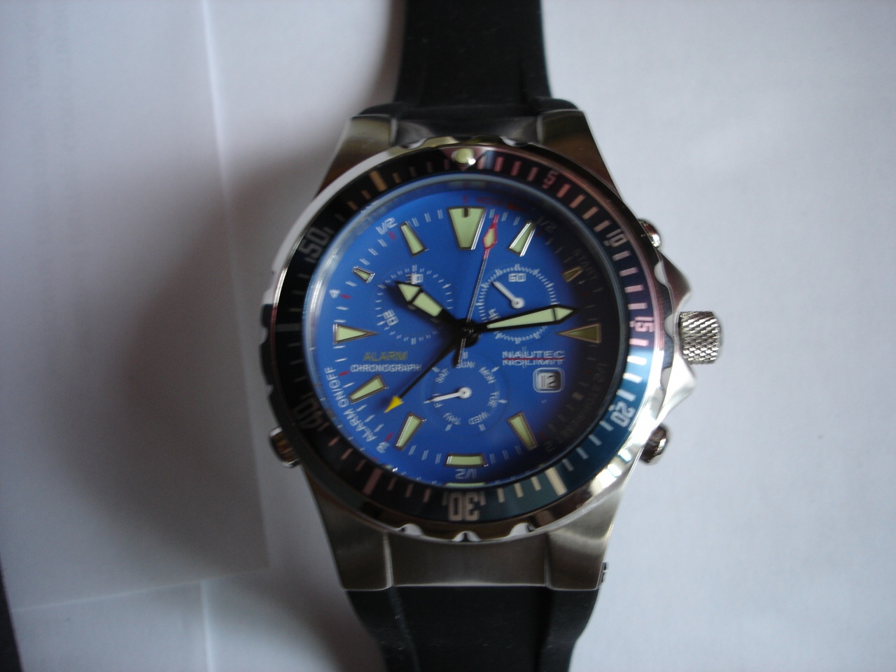 Продам часы Nautec No Limit. Кварцевые, хронограф, дата, день недели, функция будильника. Серийный номер, завинчивающаяся заводная головка и задняя крышка, водозащита 200м Вращающийся безель. Механизм швейцарский ISA Cal.8174/220. Стекло минеральное, корпус нержавеющая сталь, диаметр 44 мм. Мягкий каучуковый ремешок. Страна производитель Германия - www.nautecnolimit.de. Новые с документами в коробке.