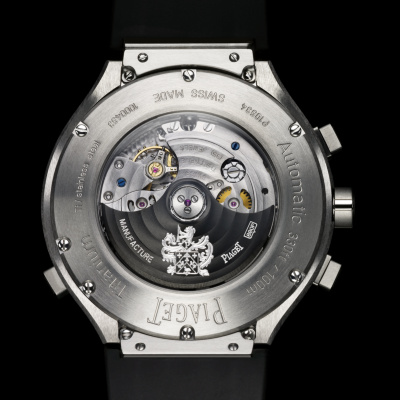 Ротор с выгравированным гербом Piaget, вороненые винты, круговой узор Côtes de Genève, платина с жемчужным зернением, мосты со скошенными углами