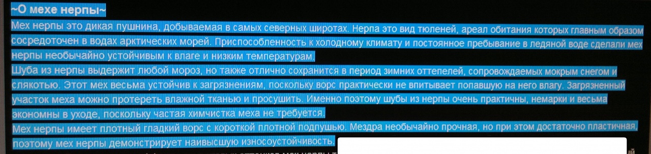 Нерпа - это животное семейства тюленей, обитающее в суровых условиях климата: среди льда, снега, в холодных водах Арктики. Именно поэтому его шкура обладает особенными свойствами по сравнению с пушниной: теплая и очень плотная - она отлично защищает от пронизывающих ветров и мороза. Среда обитания нерпы - водяная, поэтому её мех не подвержен износу из-за влаги (сырости, снега и дождя) и грязи, которые неизбежны в нашем климате. Достаточно встряхнуть мокрую одежду из нерпы, протерев её мягкой фланелькой, и вывесить на вешалку для просушки, чтобы она вновь приобрела первозданный вид. Фактически мех нерпы не намокает - он водонепроницаем: в слякоть, под мокрым снегом и дождем он сохранит свой элегантный внешний вид и теплоизоляционные характеристики.Мех нерпы прочен, не выгорает на солнце и не лезет. Даже при довольно небрежном отношении - износостоек: изделия из него можно носить долгие годы( более 16 сезонов). При этом за ним требуется минимальный уход - грязь легко удаляется с поверхности ворса влажной губкой. Из-за практичности и неприхотливости мех нерпы пользуется любовью и предпочтением энергичных людей, не любящих, когда одежда сковывает движения, и ведущих активный образ жизни, часто бывающих в разъездах и на свежем воздухе: бизнесменов, путешественников, молодежи.