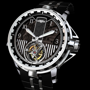 Клеть турбийона - на лицевой стороне рядом с указателями часов и минут и минутным репетиром, а время второго часового пояся отображается на другой стороне корпуса.