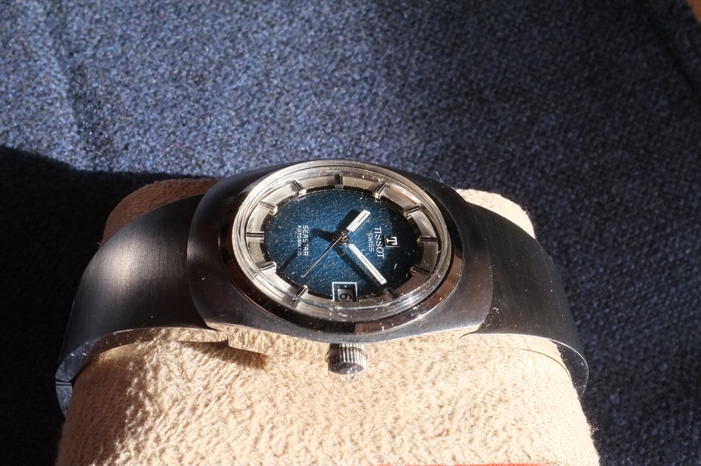 Оригинальные швейцарские часы 1970-х годов TISSOT Seastar с отображением даты мужские часы. Как вы можете видеть на фотографиях эти часы находятся в прекрасном NOS (новом) состоянии. Очень красивый глубокий синий перламутровый циферблат со сверкающими звездочками (ночное небо) с призматическими часовыми маркерами. Маркировка TISSOT циферблата, крышки (внутри), заводной головки, механизма и браслета. На задней крышке до сих пор присутствует защитная наклейка. Стальной корпус и браслет сатинированы. Корпус и браслет не подвергались полировке. Из-за долгого хранения присутствуют микро царапинки и кракелюры на циферблате( видны только на солнце) . Оригинальный швейцарский автоматический механизм TISSOT 2481 разработанный в сотрудничестве и эквивалент OMEGA 1481.