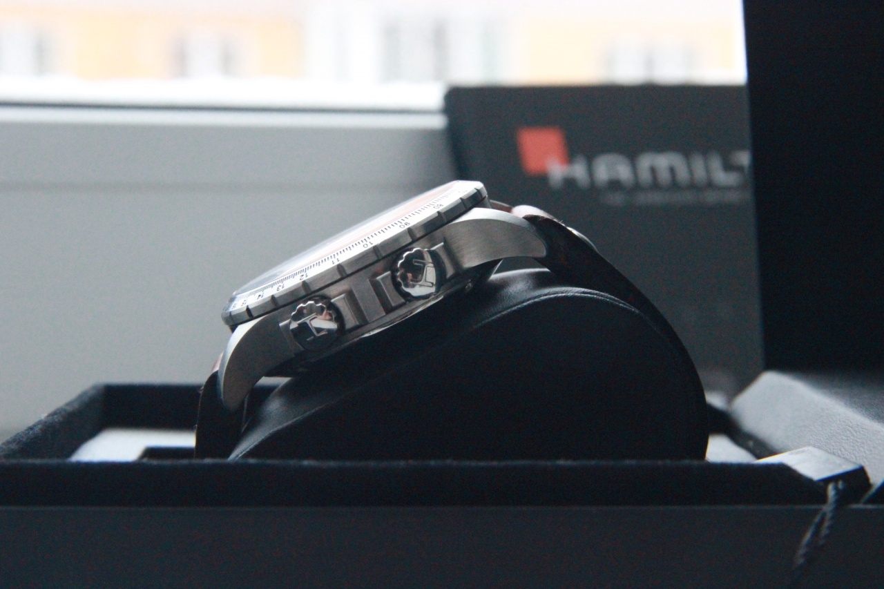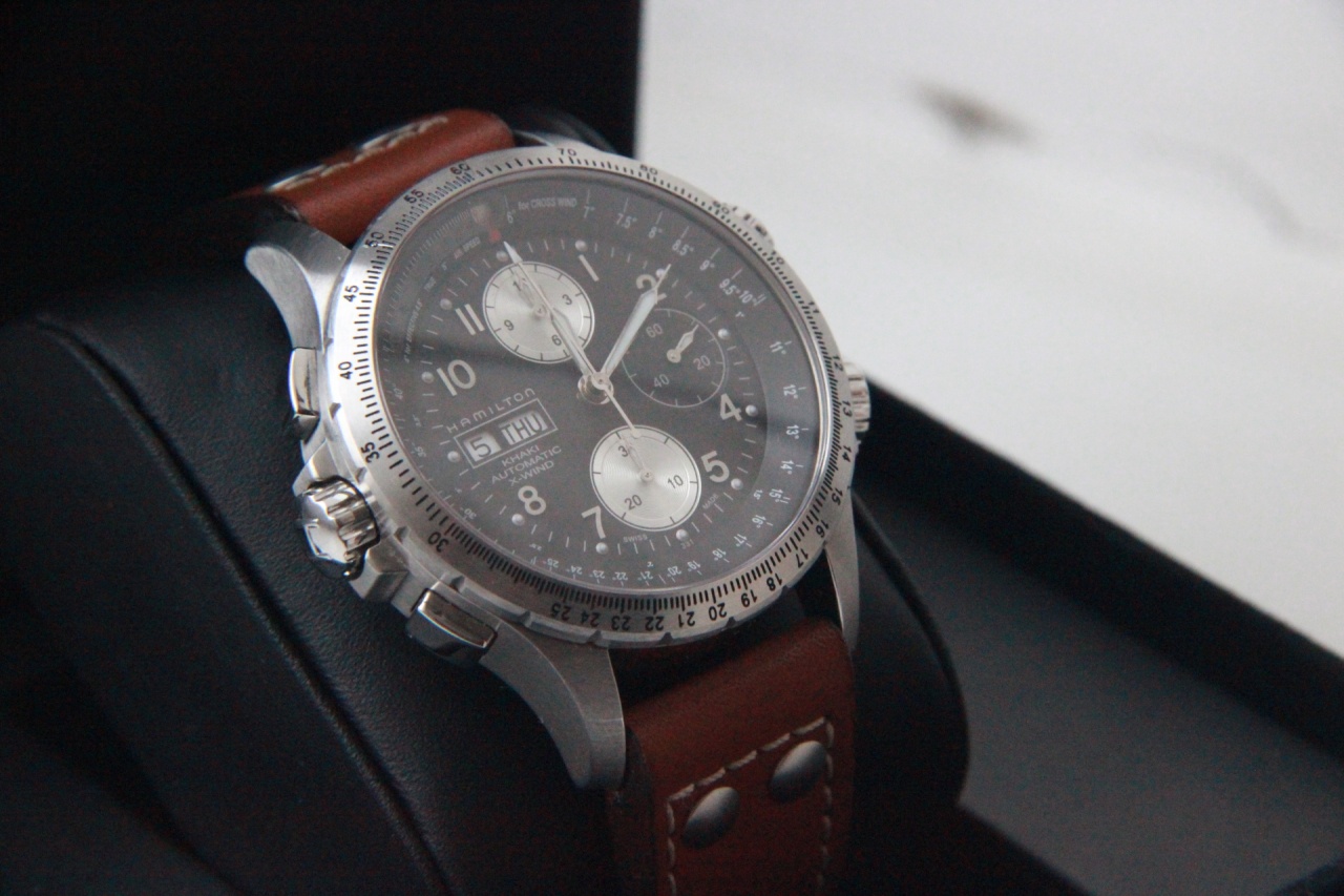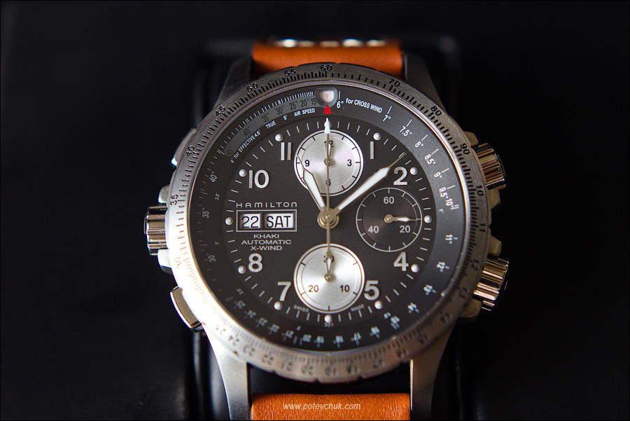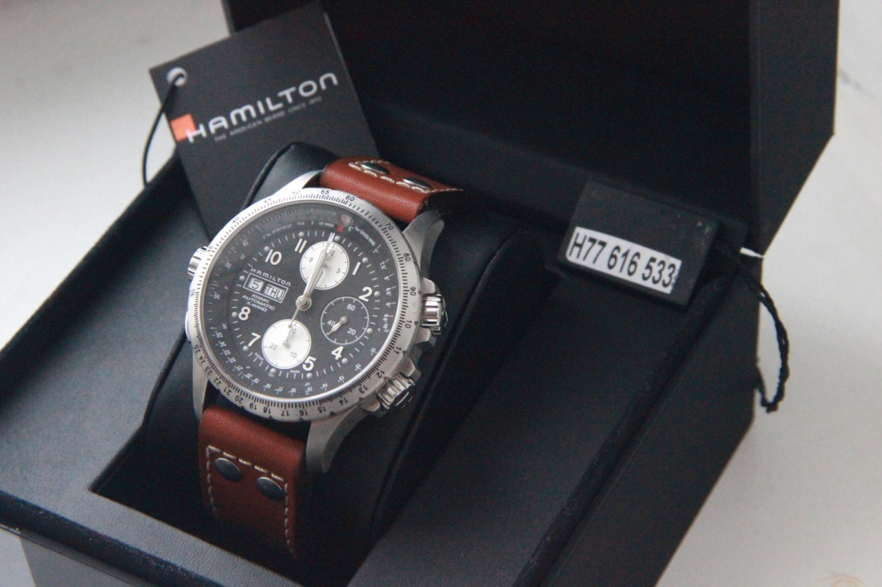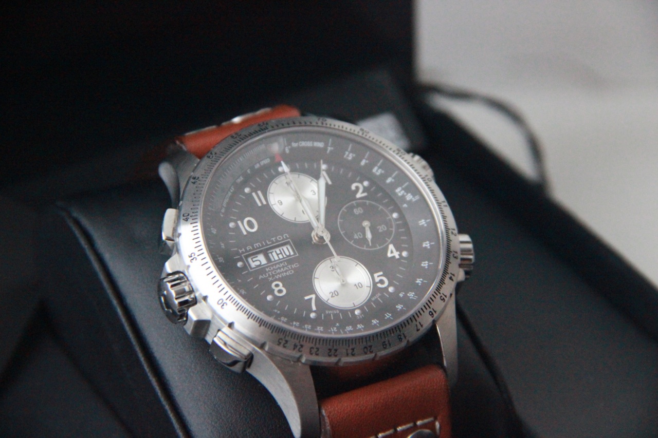 В продаже мужские механические часы с автоподзаводом . Корпус этих часов крупного размера (44 мм.) и выполнен из нержавеющей стали. Модель Khaki X-Wind Auto H77616533 имеет сапфировое стекло, кожаный ремешок коричневого цвета, чёрный циферблат. Водоустойчивость: 100 метров. Дополнительные функции и особенности: дата, день недели, хронограф, лётные функции. Полная заводская комплектация Hamilton.