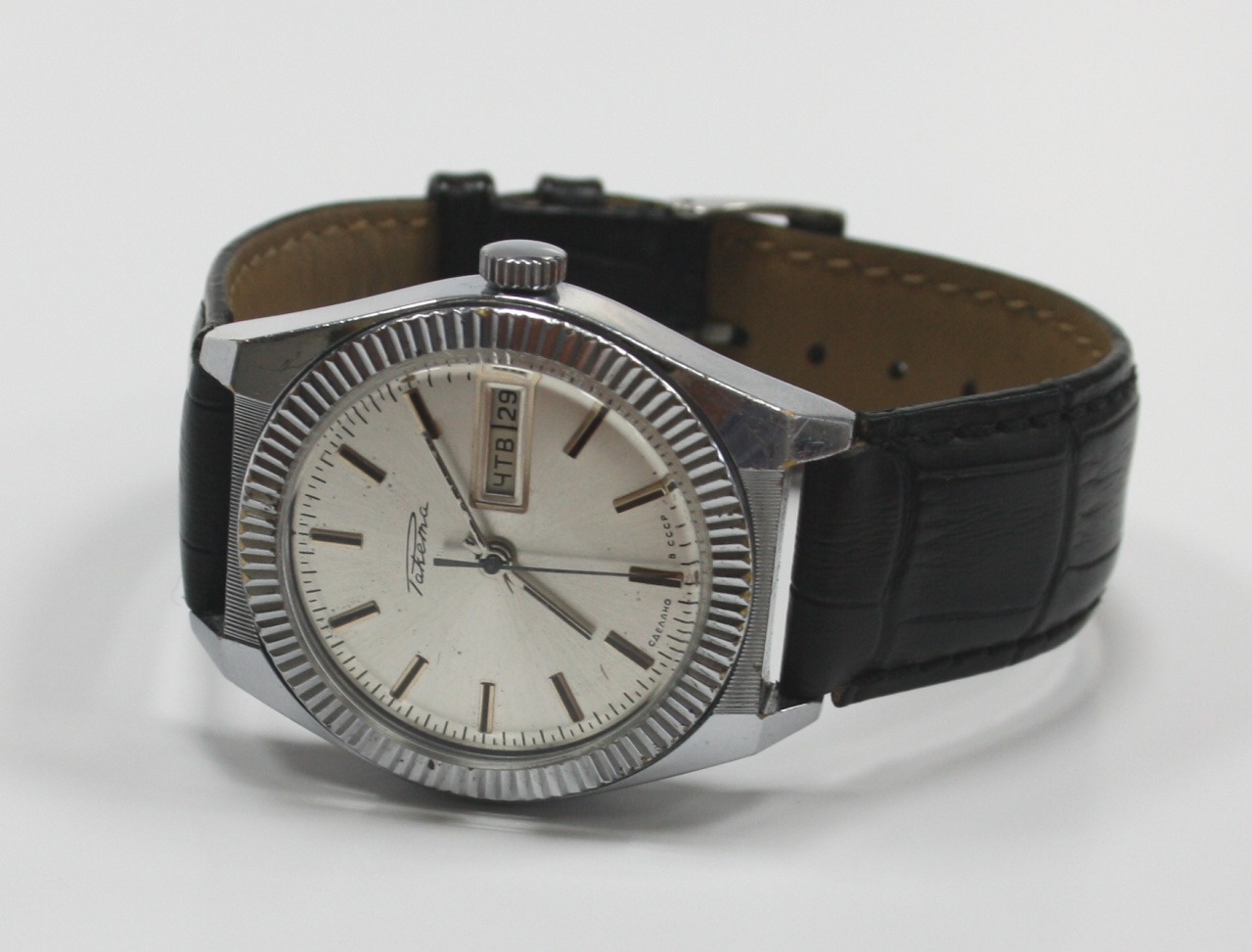 Бонус к часам - практически новый часовой ремешок немецкий Stailer (сейчас цена в продаже такого ремешка 1000-1200 р), изготовлен из кожи теленка, с нанесенным на нее тиснением, имитирующим узор кожи аллигатора.