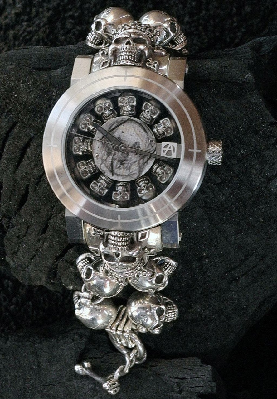 Циферблат сложный многоуровневый, в его центре расположен стальной круг, на котором в виде карандашного эскиза изображен череп; на его периферии по кругу размещены одиннадцать объемных черепов, выполняющих роль часовых индексов. Накладной стальной логотип бренда ArtyA установлен на 3 часах. На часовой и минутной стрелках - люминесцентное покрытие черного цвета.