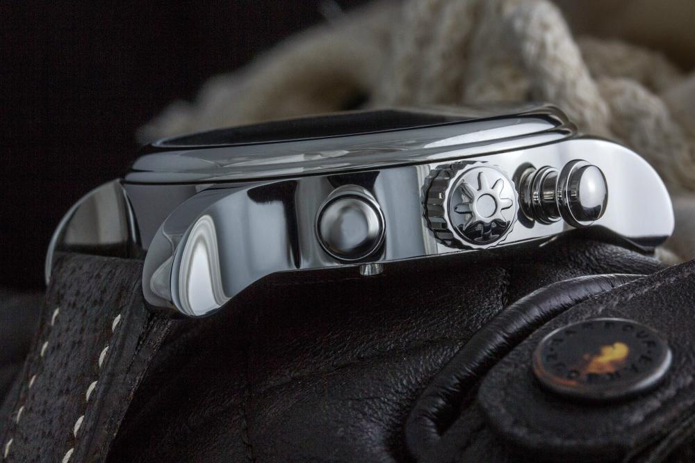 Круглый полированный корпус новинки изготовлен из нержавеющей стали 316L, диаметром 43,0 мм, толщиной 16,0 мм, водонепроницаемый до 100 метров. На торце рифленой заводной головки, расположенной на 3 часах, выгравировано изображение эмблемы бренда PINION. Пушеры хронографа размещены на 2 и 4 часах. Сапфировое стекло установлено на передней стороне часового корпуса (с внутренним антибликовым покрытием) и на его завинчивающейся задней крышке (тонированное). Циферблат черного цвета, с накладными полированными арабскими цифрами и часовыми индексами, покрытыми, как и полированные часовая, минутная и секундная стрелки, люминесцентным составом белого цвета. На фланце - минутная разметка.
