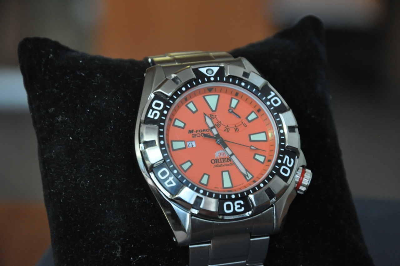 Калибр механизма - механический 40N5A, автоподзавод с возможностью ручного завода, стоп-секунда. Запас хода - 40 часов, индикация числа, индикатор запаса хода, водозащита - 200 м., поворотный безель, люминесцентные стрелки и индексы. Цвет циферблата - заводной апельсин =). Диаметр корпуса 46 мм (без заводной головки), сапфировое стекло, завинчивающаяся заводная головка и задняя глухая крышка. Корпус - сталь, браслет укорочен на запястье 17 см, одна маленькая цапапина на застежке от носки. Приобрел в июне этого года, ходил 3 месяца, пока лето не кончилось, потом лежали в коробке. Полный комплект (коробка + документы, покупались в Санкт-Петербурге у официалов). При необходимости вышлю дополнительное фото или размещу здесь. Причина продажи: все-таки немного великоваты для моего запястья. Часы находятся в Санкт-Петербурге. Вышлю по России/ближнее зарубежье.