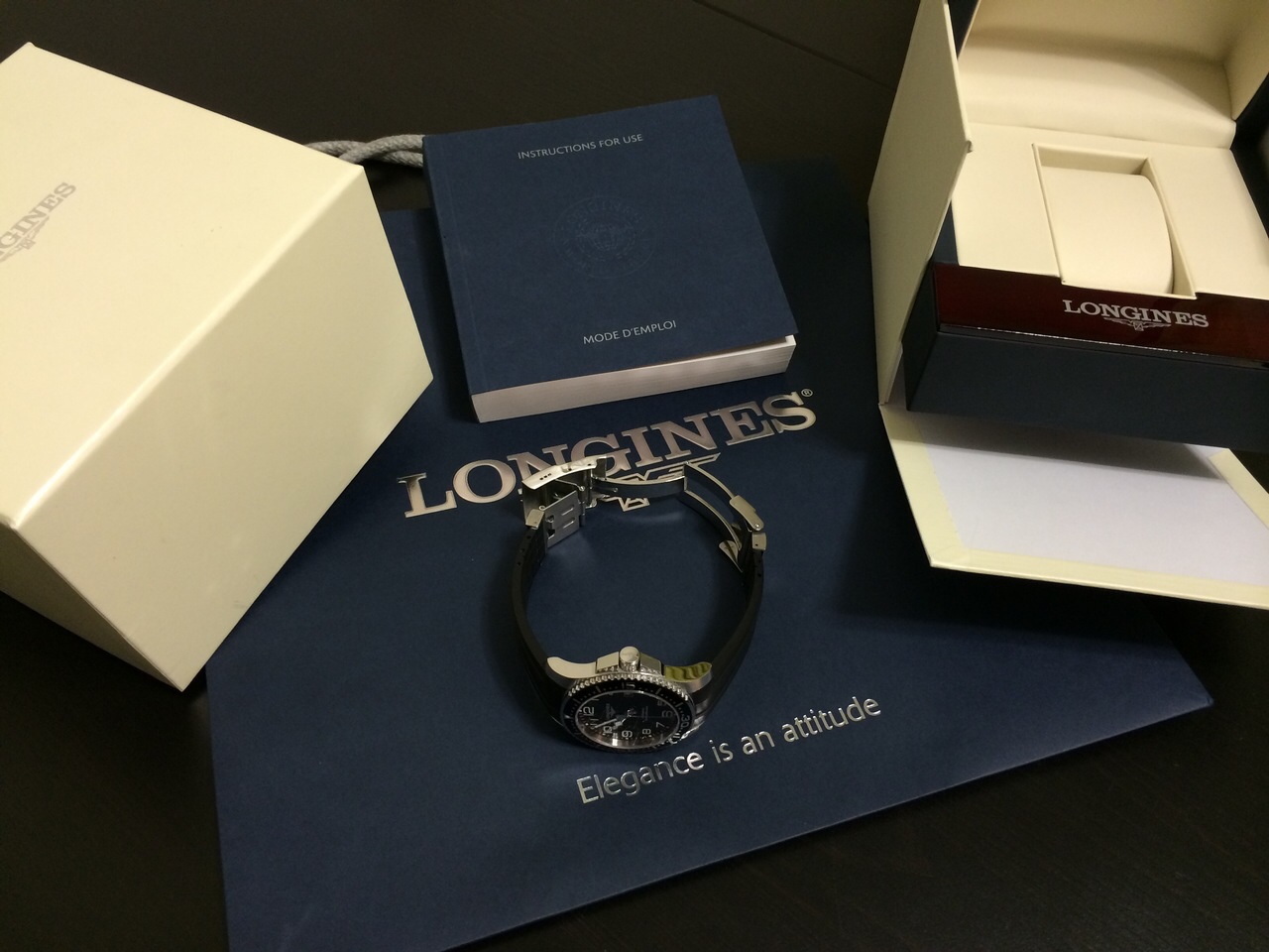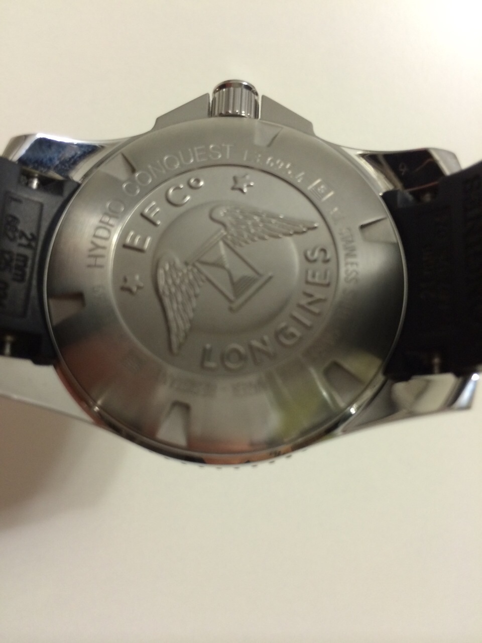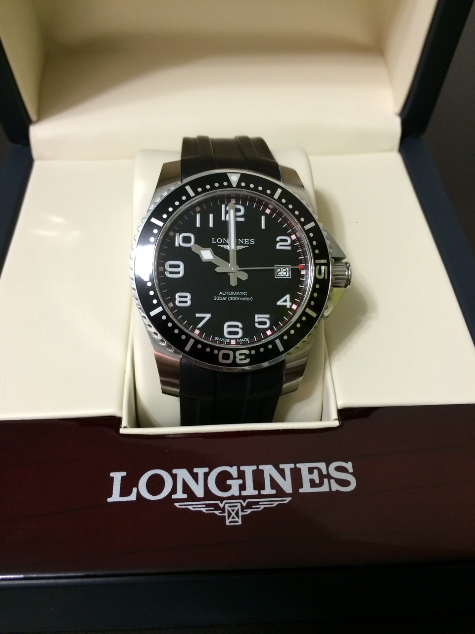 Хорошо всем известная Гидра Longines Hydroconquest реф. L3.695.4.53.2. Механика с автоподзаводом, сапфировое стекло, дата, однонаправленный безель, раскладная застежка с расширением под гидрокостюм, 300м водозащита. Диаметр 41мм, выглядят довольно крупно. Модель была представлена на Базеле в 2013г. Каучук на крупную руку.