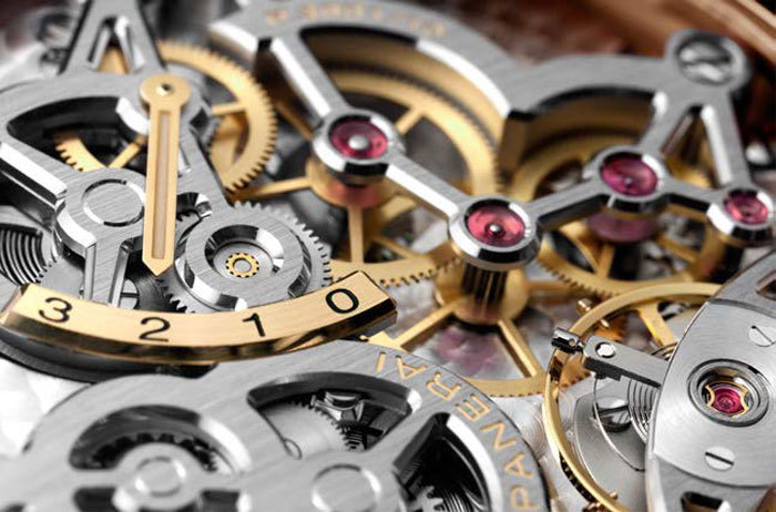 Модель оснащена мануфактурным швейцарским механизмом с ручным заводом Panerai P.3001/10, толщиной 6,3 мм, на 21 камне, состоящий из 207 деталей, с балансовой частотой 21600 полуколебаний в час (3 гц), тремя заводными барабанами, восьмидневным запасом хода, функциями индикации часов, минут (посредством соответствующих центральных стрелок), секунд (на малом боковом циферблате, расположенном на 9 часах), даты (посредством соответствующего цифрового указателя в апертуре, расположенной на 3 часах), времени второго часового пояса (посредством соответствующей центральной стрелки) и запаса хода (посредством соответствующего аналогового указателя, расположенного на задней стороне механизма). Калибр отлично отделан: мосты и заводные барабаны скелетонизированы, с циркулярным зернением, ручным снятием фасок, гравировкой.