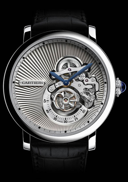Несмотря на отсутствие характерных римских цифр, шедевр от Cartier узнается по ряду других признаков: круглая форма корпуса, сапфировый кабошон и литера С, обозначившая индикатор малой секундной стрелки. Децентрированный парящий турбион, угнездившийся в окошке секундной стрелки, лишь усиливает графичность всего ансамбля.