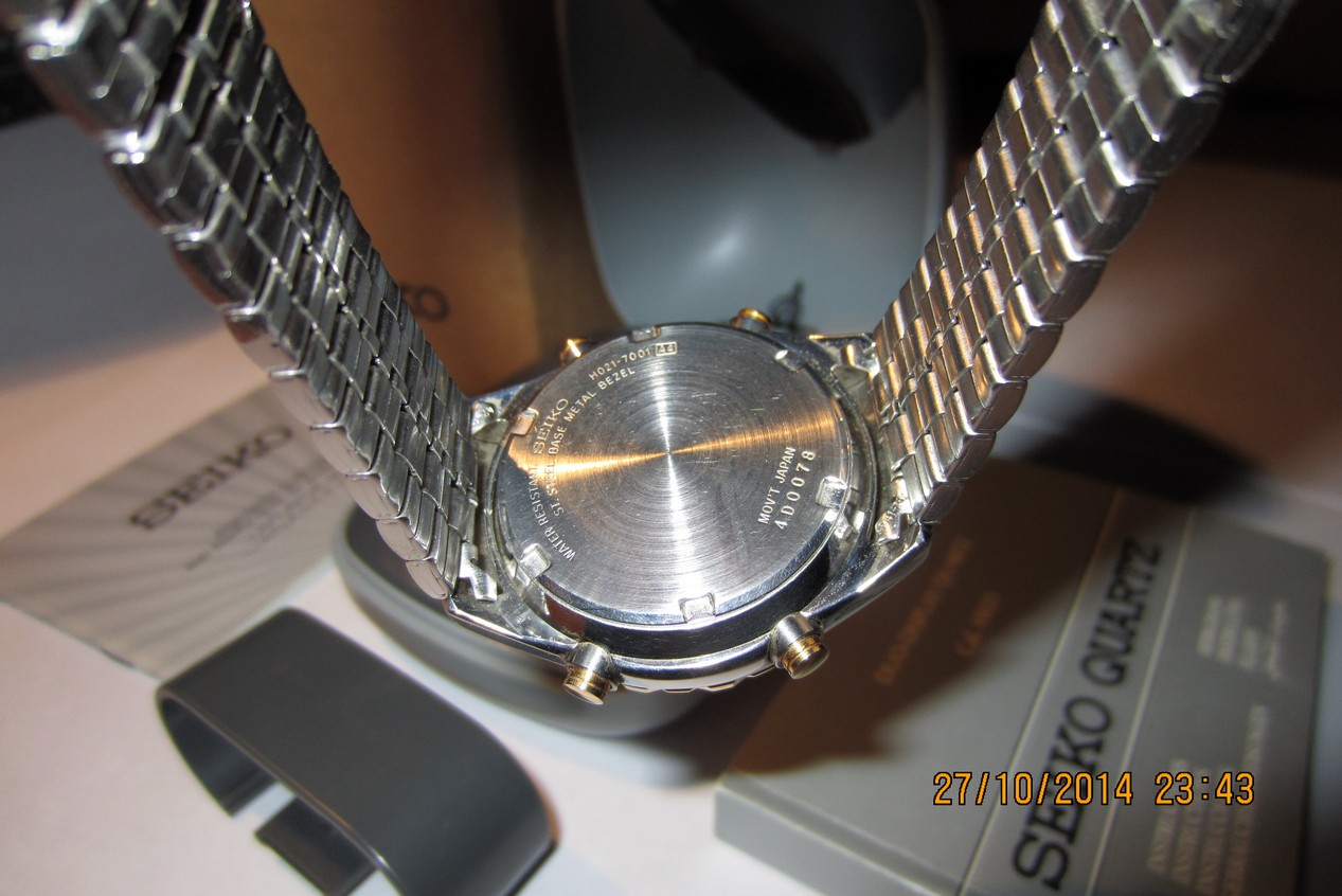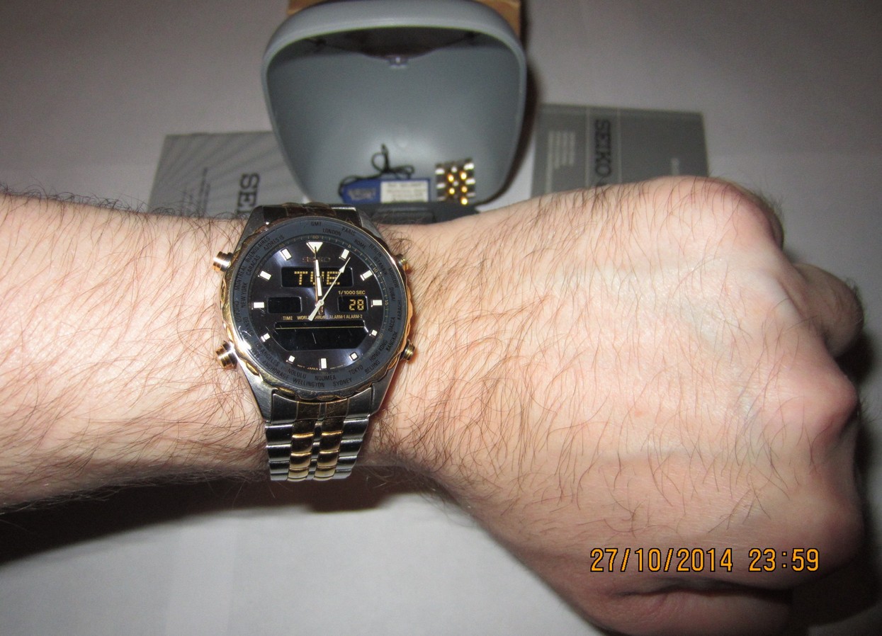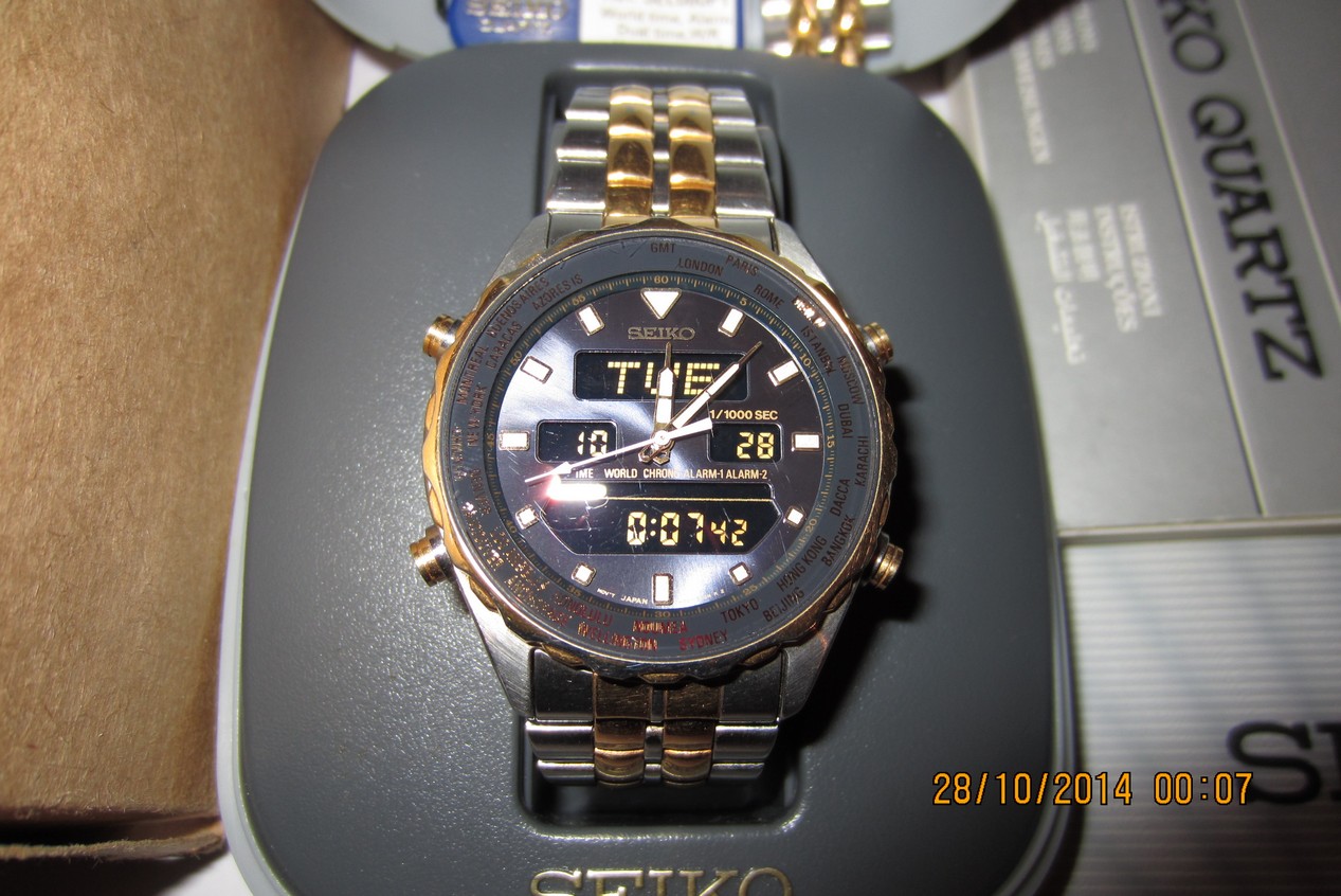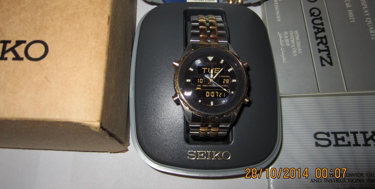 Аналогово-цифровой хронограф с мировым временем и LED-индикацией. Относится к топовой линейке спортивной серии Seiko коллекции 1994г., предшественница модели Sportura. Дата покупки – 1995г. На рынке данная модель практически не представлена.