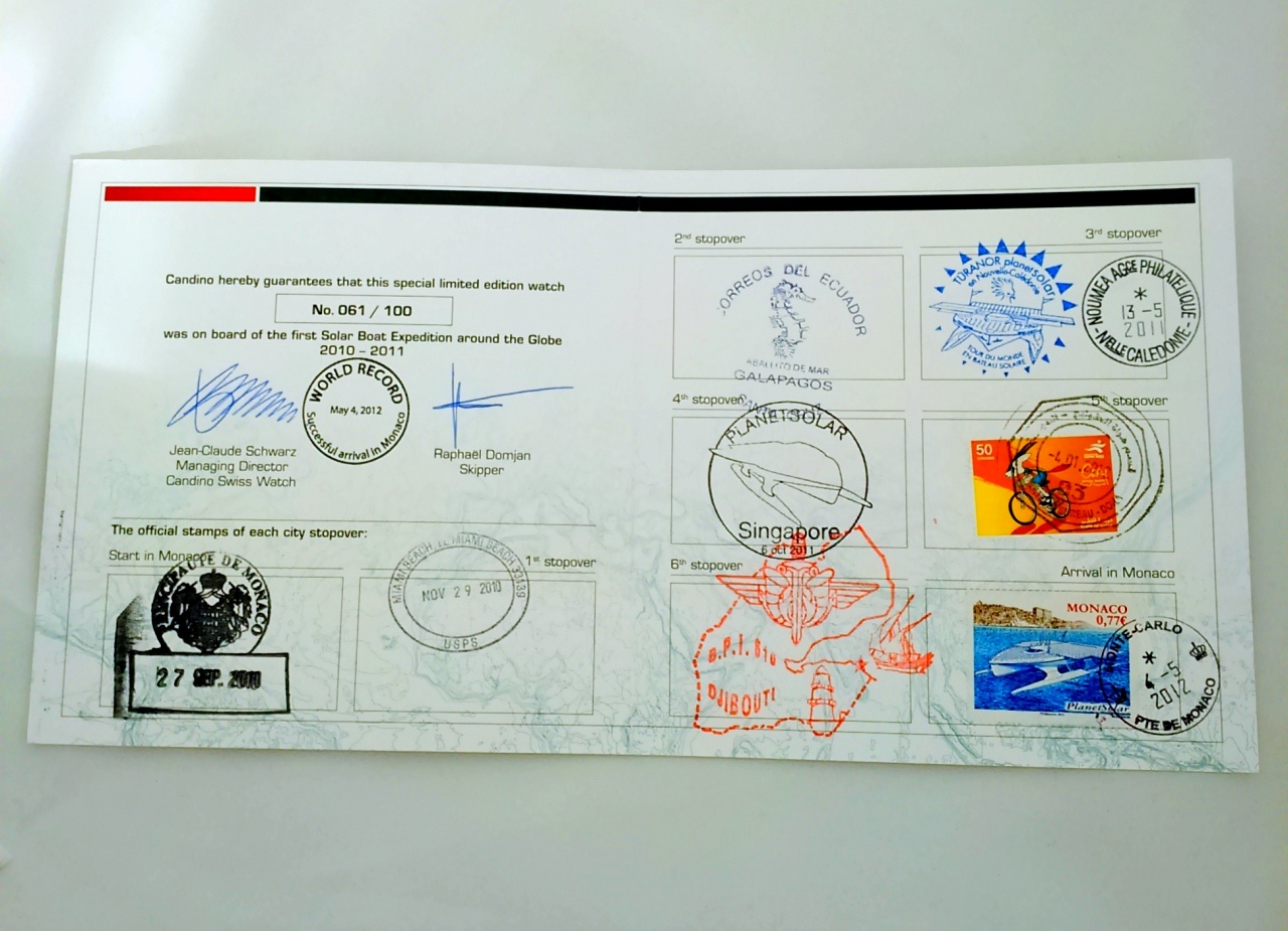 Часы Limited Edition, лимитированной серии в 100 экземлпяров, имеют уникальный номер 61 из 100, выгравированный на корпусе. Это часы с уникальной историей: они участвовали в проекте кругосветного путешествия на яхте, работающей на солнечной эренгии Round the World Solar Boat Expedition. Все время экспедиции 100 часов Candino PlanetSolar хранились на яхте, которая обошла весь земной шар. Сертификат, свидетельствующий о стоянках в портах по всему миру прилагается к данным часам.