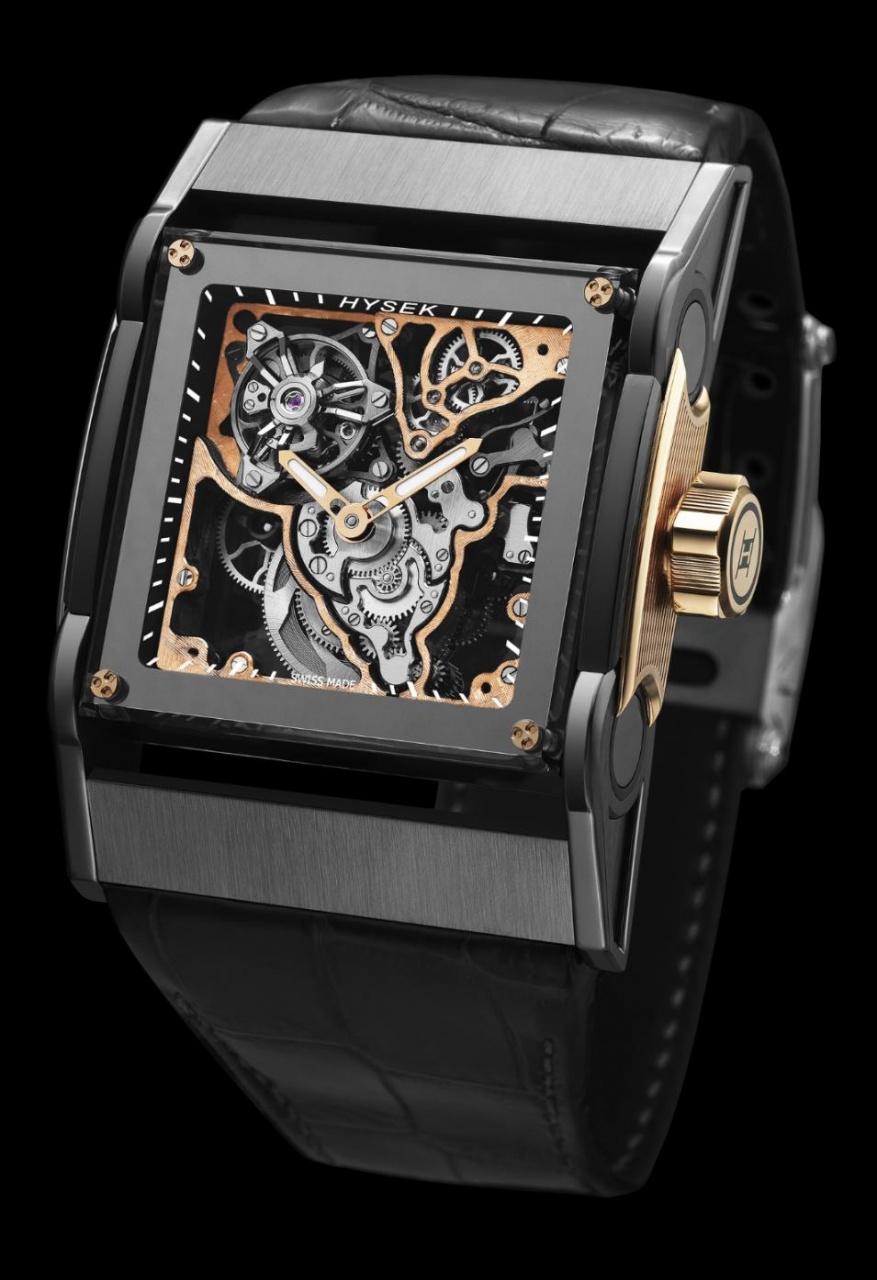 Новая лимитированная модель Furtif Skeleton Tourbillon от швейцарской часовой компании Hysek имеет прямоугольный корпус, изготовленный из 18-каратного розового золота и титана с PVD-покрытием антрацитового цвета, длиной 51,0 мм, шириной 44,0 мм, толщиной 14,0 мм, водонепроницаемый до 30 метров. Фиксированный безель на четырех винтах; подвижные откидные ушки, обеспечивающие идеальное прилегание часов к запястью. На торце рифленой заводной головки, расположенной на 3 часах, выгравировано изображение логотипа бренда Hysek. Сапфировое стекло с антибликовым покрытием установлено на лицевой стороне часового корпуса и на его задней крышке. Циферблат биколорный скелетонизированный с минутной разметкой на его фланце. Стрелки золотистого цвета, покрытые люминесцентным составом белого цвета.