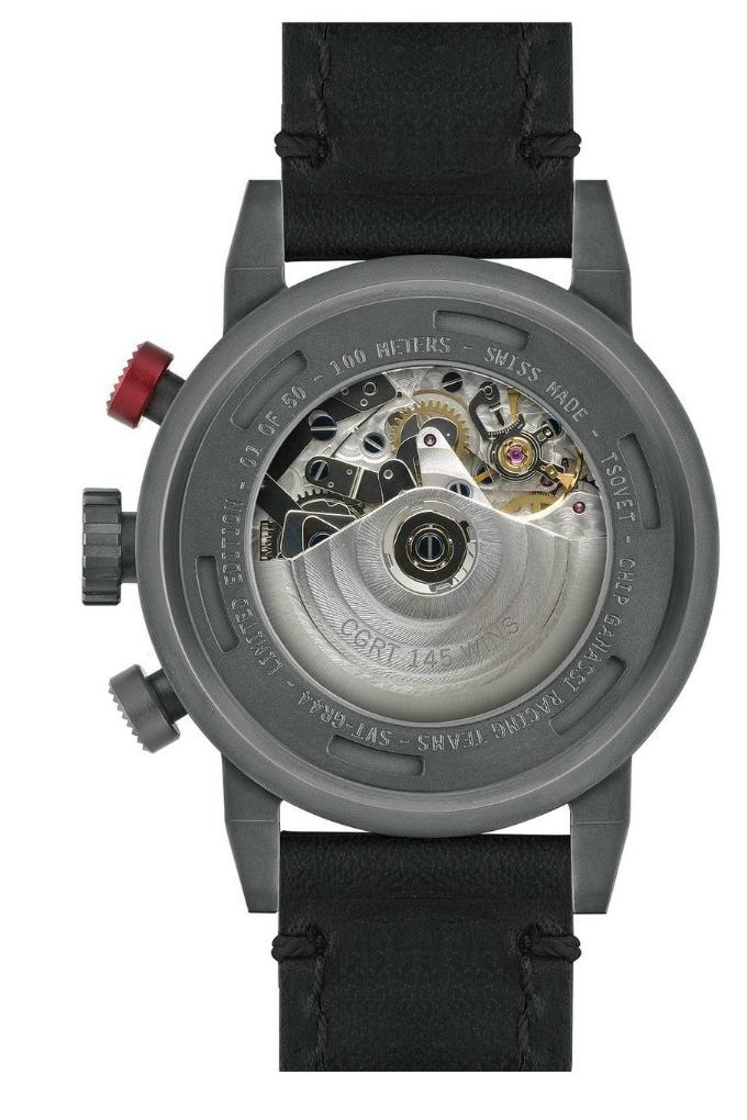 Новая лимитированная модель SVT-GR44 Automatic Chronograph (Swiss made) от американской часовой компании, расположенной в Лос-Анджелесе (Калифорния), Tsovet имеет круглый матовый корпус, изготовленный из нержавеющей стали, отделанной в стиле вороненой ружейной стали, диаметром 44,0 мм, толщиной 12,6 мм, водонепроницаемый до 100 метров. водонепроницаемый до 100 метров, с 22-миллиметровым расстоянием между ушками. На торце рифленой заводной головки, расположенной на 3 часах, выгравировано наименование бренда Tsovet. Пушеры хронографа размещены на 2 (красного цвета) и на 4 часах. Сапфировое стекло установлено на передней стороне часового корпуса (с антибликовым покрытием) и на его завинчивающейся задней крышке. Циферблат матово-черного цвета, с печатными серебристыми арабскими цифрами и черными часовой и минутной стрелками, покрытыми люминесцентным составом. Центральная секундная стрелка имеет красный наконечник, а все остальные стрелки выполнены в красном цвете. На периферии циферблата расположена круглая тахиметрическая шкала.
